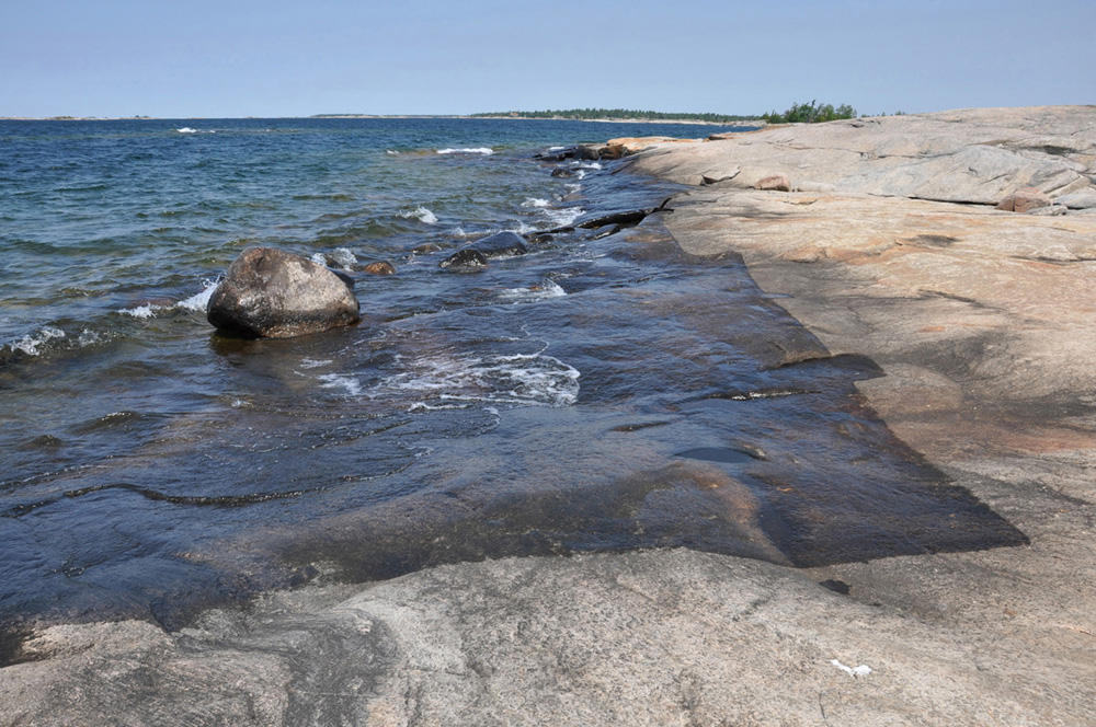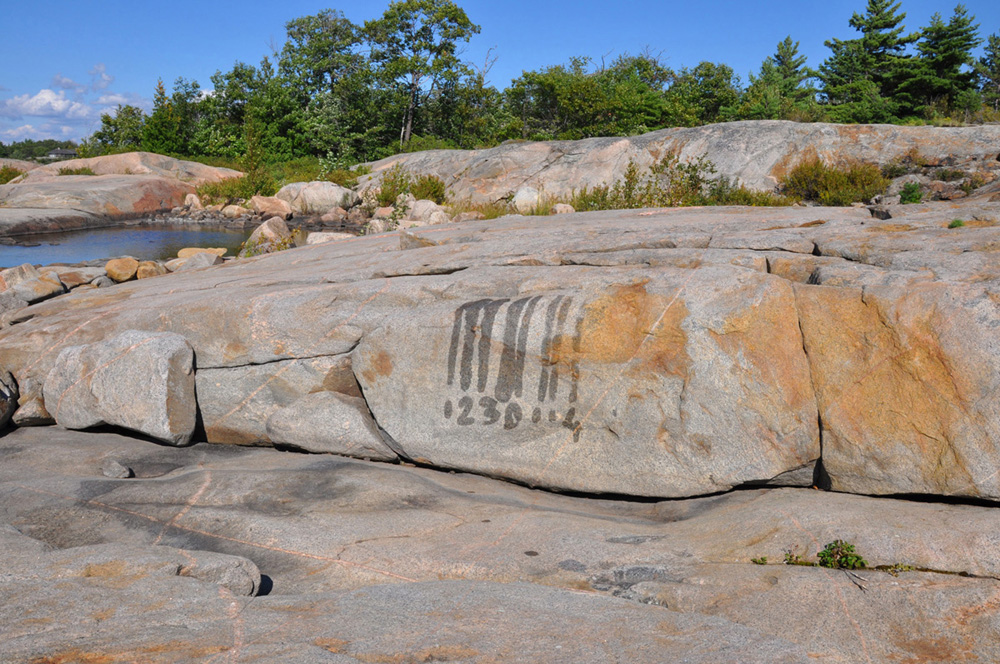 Through a series of new video-works, insight and narrative are leant to the duo’s representative achievement, Water Drawings, a collection of photographs from 2012 that pictures their invention of “water graffiti.” In these, Blue Republic paints impressions with water on Georgian-Bay rock formations, their images disappearing with the day’s heat, and time. Where the photographs merely framed the effort and distilled the action into hieroglyphs, the videos give us something more fulsome: the activity of mark-making, the trajectory that produces impermanence. In this temporal capture, too, are the distinct(ly Canadian) pleasures of hearing the Bay’s lapping water, the paintbrush stroking dry rock, the padding of Kudlinski’s bare feet as he moves around his brief object. We witness the artist’s effort as we feel the scene’s tranquility, and something emerges in between – a poetry born of futility.