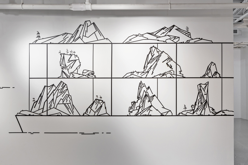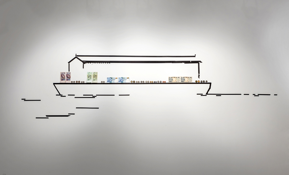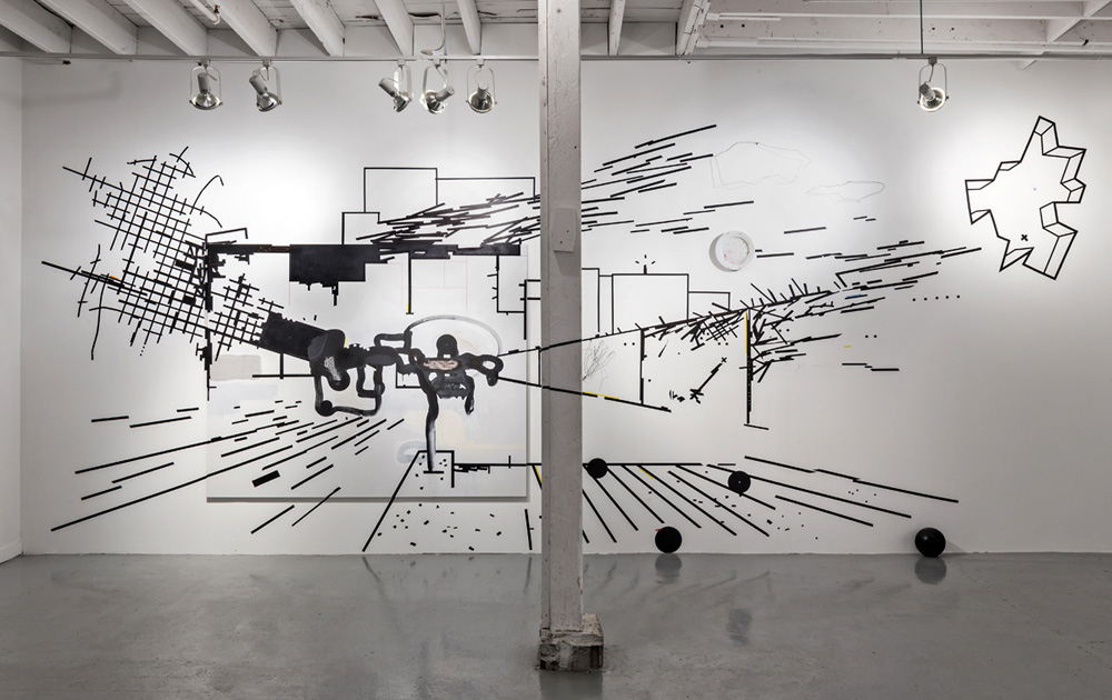Now to the front gallery: when I enter, an expansive wall-work both hits and absorbs the eye. In its use of perspective, it feels as though it absorbs the body, too. An electric-tape “mapping” images an elusive picture, where chaotic and converging grids emanate out from a disturbing and muddy central character that perfectly marries figuration and abstraction. The entire front gallery is devoted to similar site-specific, wall-scaling constructions, but it’s this first one that captivates the most, and returns me to it magnetically, like a wringer begging response. Where the other wall-works frame recognizable, if surreal, subjects (also constructed with electric tape, with coins and other currency-like detritus attached, and featuring subjects like large container ships bearing mountains in their trunks), this first mural achieves something the others don’t: a disquieting image that affects more than signification, but feeling.