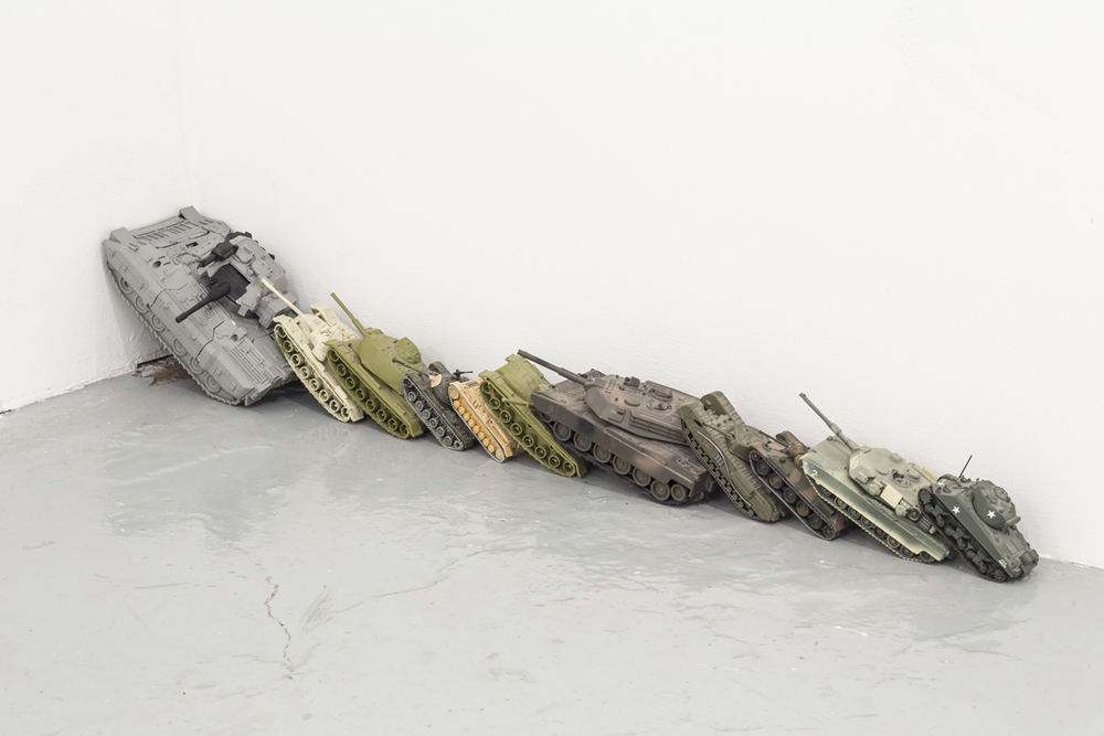 While the opening gallery is peopled in the corners (and, in the case of a pithy central sculpture, the main footpath) with overly-literal constructions – tongue-and-cheek phallic missiles; tiny, domino-laid tanks; a gun-decorated chair – it’s the wall-works that signal an important achievement for the Polish-Canadian couple, and a way forward. Here, and particularly in the first-seen mural (F Like Love – I would ask for better titling from the collective), an attempt to grasp something elusive goes pictured and, in the effort, complicated. At the heart of its chaos, F Like Love frames a canvas like a frayed nerve-center, its system skewed and set to self-deconstruct. The canvas, in fact, is easy to miss, so effective is Blue Republic’s manipulation of perspectival space. (Even a load-bearing column is marked by tape, such that, at a remove, it falls into step with its background tumult). These are artists who fully grasp the construction of three dimensions from two, and thoughtfully articulate lawnessness through form. They develop upon their past work (city-building, game-board machinations) with their vernacular of networks, but here they finally picture a center in the ferment, despite its implacability. Disturbing in the way that Francis Bacon portraits are all movement and no center, Blue Republic anchors its anarchic mural with a messy figure who agitates in his machine-like context. More, though, this dark character produces a protagonist, and the collective’s first resolution. It’s one we cannot fully place, though. Amid all its abandoned boardgames and past its ghostly gestures, Blue Republic finally presents a player. But we cannot name him, and more disturbing, we can’t predict his first move.