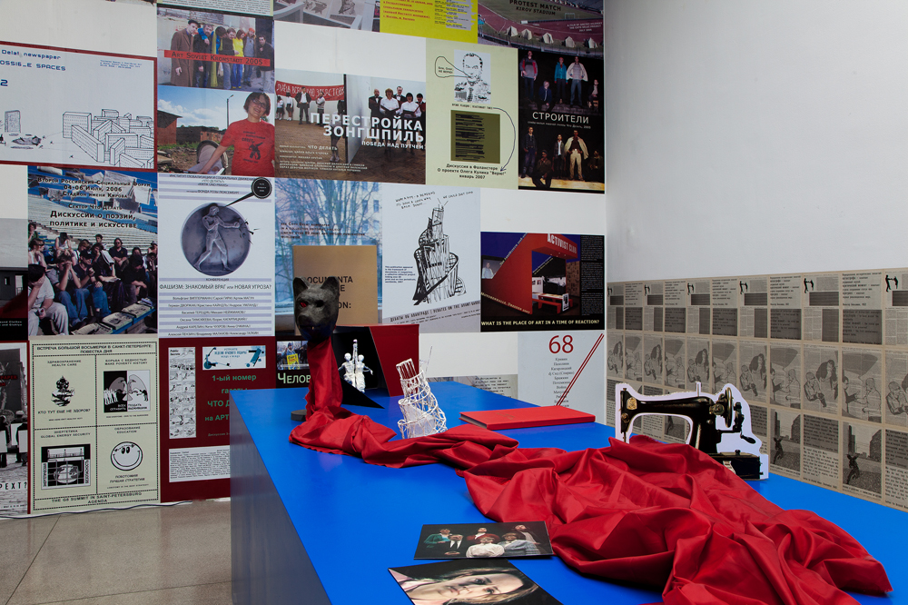 Chto Delat deals with this problem head-on. In Secession’s grand hall, we first see a series of large images joined together by a river of red fabric that, despite a blurred pixilation, betray their origins. Chto Delat has often made art about the body as metaphor, the social body. “Radicalize your disease” runs a slogan in one of the videos that play in the archival rooms to either side of the hall. The red connective tissue may be a “red thread” – the idea of a secret, communist, subtext underlying history – or it may be more obvious: the blood that suddenly, with Ebola, is again a bearer of our deepest anxieties.