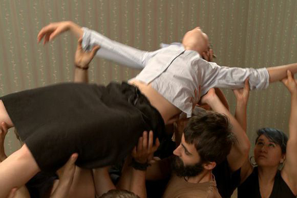 Hidden behind a large wall is a four-channel video (whose title, in typical Chto Delat fashion, includes a period), The Excluded. In a Moment of Danger, 2014. It was made in the summer of 2014 with former students of the collective’s St. Petersburg-based pedagogic project, the “School of Engaged Art,” and presents a series of episodes in which a dozen young people aimlessly scroll through social media, confronting images of the most dire sort. The online maelstrom leaves them wordless, and they collapse on a set of large, colorful cubes, gradually stirring when a large ear is brought into the space. So it’s about listening, and they start listening to each other as they relate where they were when they learned about a disaster, from 9/11 to the 2002 gassing of a Moscow theater, wars in Chechnya, Serbia, and Iraq, attacks on the Russian punk group Pussy Riot at the Sochi Olympics. Connected to personal events, the film tells us, history can be located even if it’s incomprehensible. At one point, a woman, Anya, leaves, to “picket alone” – the only type of protest permissible in Putin’s Russia. She comes back beaten, her body carried through the air like a martyr in Gaza, and her friends wonder who the assailant was – an army vet suggests one person, an old lady suggests another, a professor offers a third. Chto Delat’s film is truly a report on “Life During Wartime,” as the old Talking Heads song has it, and it would be dire-watching if it wasn’t so artfully assembled. The four-channel installation requires a viewer’s careful attention that’s rewarded by quick edits, unexpected details, news footage, and shots of heroes from Guy Fawkes to Aaron Swartz.