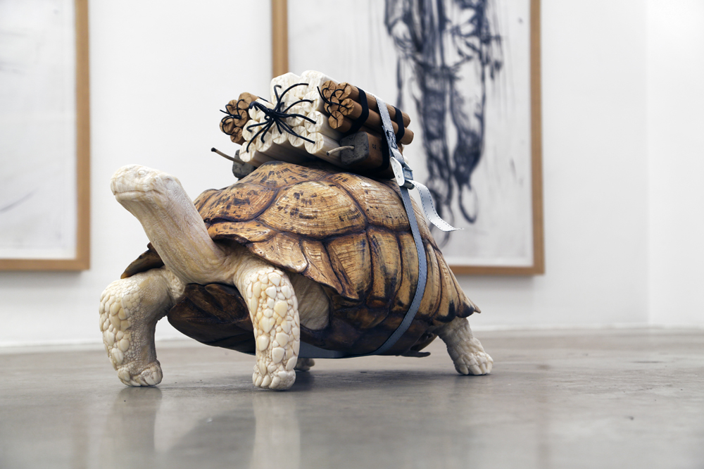 And in the front room of Christine König Gallery, there lies a sculpture of a turtle or a tortoise. (The work’s title is Turtle, but it’s made with tortoise shell.) What look like dynamite sticks, and other components of a suicide-bomber’s kit, are strapped to its shell. No one in the gallery – it is a Thursday night, there are openings all up and down Schleifmühlgasse in Vienna – is panicking, so it’s probably not an actual suicide bomb. (Although, the gallerist told me the next day, some of the dynamite is actual TNT, though without its blasting caps). Elsewhere in the exhibition dynamite sticks are crafted from camel bones and buffalo horns. The camel bones are a lustrous yellow and white.