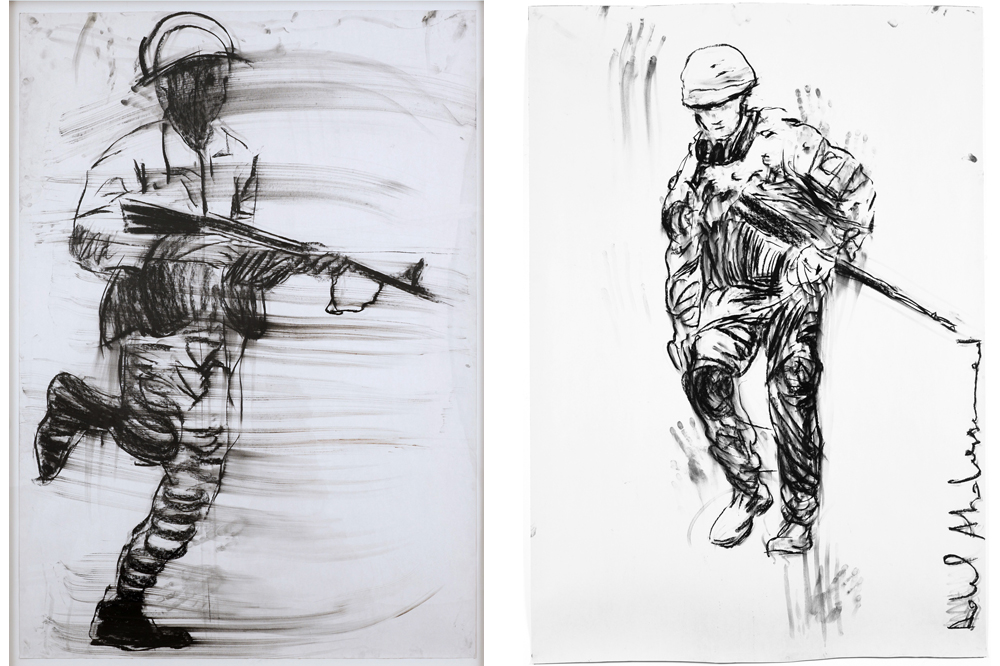 When I was in the Canadian military in the 1980s, we were trained to hold our weapon pointing up: that way, it was easier to drop the barrel down, and to aim and fire. So the direction of the weapon in these drawings is significant. In some of them, the weapon – the soldier – is ready to fire. And with his weapon raised, the soldier aims, and his eye becomes a gun – like when an artist draws.