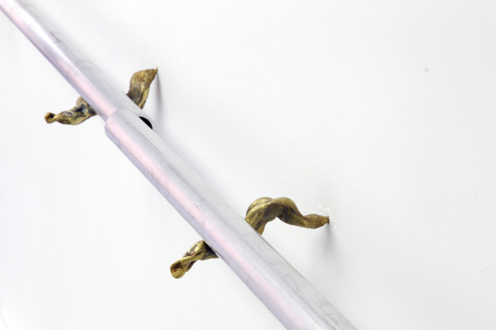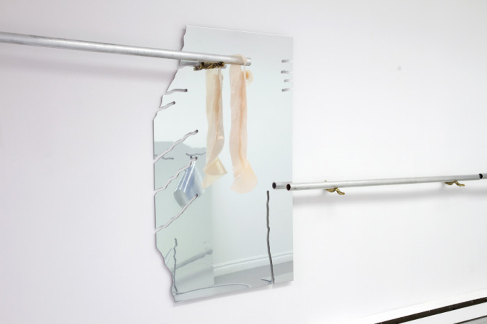 A visual hallmark of the sculptures – the fleshy, pink, and shiny silicone sheet of Deferring Beings – dangles prominently from the end of one of two wall-mounted aluminum bars. This installation-cum-modular-dance-studio includes brass brackets modeled after flatworms and another tunnel-marred mirrored panel. Just abstracted enough to avoid being overt, each of these works present a tight composition endowed with a sensuality that is as grotesque as it is erotic. The installation’s sense of fluidity and spillage expresses a foregoing of control as a counterpoint to the male-dominant oppression of female emotional and sexual emissions. The work positions itself in a history of art-making which omits the female body but embodies the feminine (think Eva Hesse and Helen Chadwick). It also underscores Kang’s position in a generation of young female abstractionists characterized by a materials- and process-driven fabrication style that combines sculpture, photography, and found objects in the production of idiosyncratic and even surrealist work (Rochelle Goldberg, Rachel De Joode, and Letha Wilson come to mind).