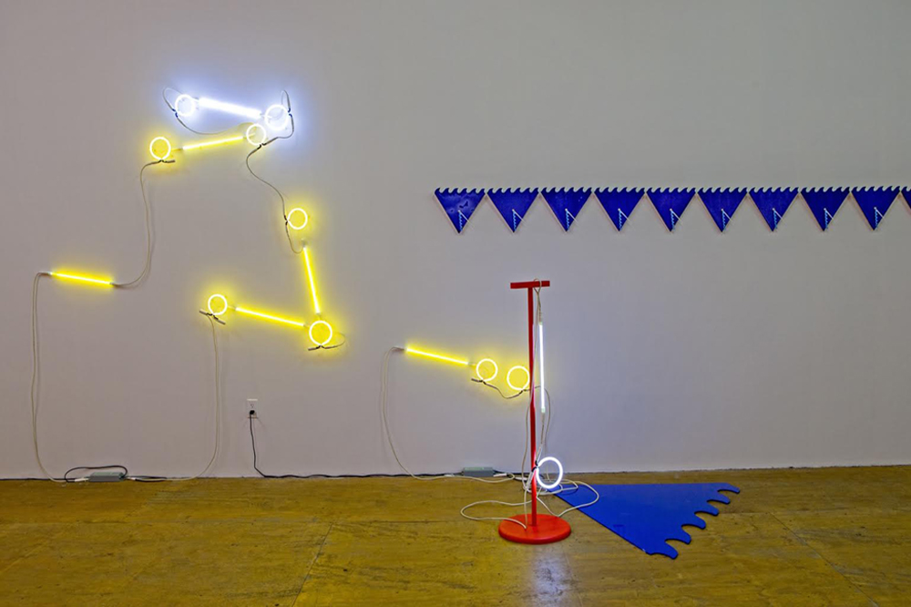 The opening assertion of Uncounted showcases much of Roysdon’s poetics in its combination of declarative tone, humble description, and utopian premise – the fabrication of time. At Participant, a conglomeration of abstract shapes in pastels, fabricated clocks, and line segments made in neon suggested a personal cryptography. The wave-shaped clocks hung in a straight line on a wall alongside free-standing variants, the generous white and yellow light of the neon clashed against a pink wall, and a grid of black-and-white photograms (photographic images made without negatives) hung like scrapbooked riffs on Moholy-Nagy. When read alongside the free mass-produced text of Uncounted, the exhibition began to cohere but only to a point. If Only a Wave relied on a communication composed of a formal visual symbolism and a theoretical manifesto, with all the gaps in knowledge between the two. Or rather, these aesthetic elements “discomposed,” one of the many reoccurring mantric tropes Roysdon gathers on text and on the wall: “discompose,” “What is time if not activism?”, “unseen in time,” the wave, the clock, the line, and more behind the scenes: a queerness.
