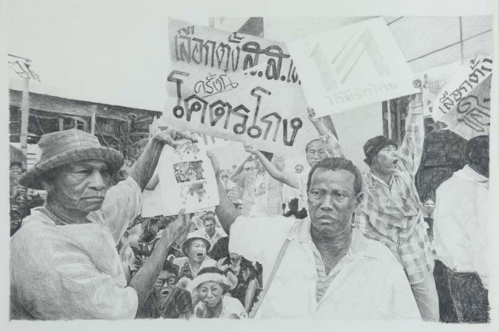 Rirkrit Tiravanija’s series Demonstration Drawings (in which he commissioned Thai artists, many of them former students, to create a series of photorealistic pencil drawings “depicting responses to power, oppression, and global capital”) fills an entire room with sketches of gatherings from around the world: pro-democratic demonstrations in Thailand, grieving families holding photos of desaparecidos, trade union marches, protests against Don Imus, and on and on. The inherent ephemerality of the Happenings is archived here, and while altogether the drawings do not present a unified vision, they do suggest a larger turmoil. In describing change accomplished through protests in their book Multitude, Michael Hardt and Antonio Negri compare the process to a swarm: “If one looks inside a network … one can see that it is indeed organized, rational, and creative. It has swarm intelligence … [However,] the members of the multitude do not have to become the same or renounce their creativity.” The sense of Demonstration Drawings is of this very swarm at work. One experiences a sort of zooming out, a revealing of the macrocosm of political unrest.