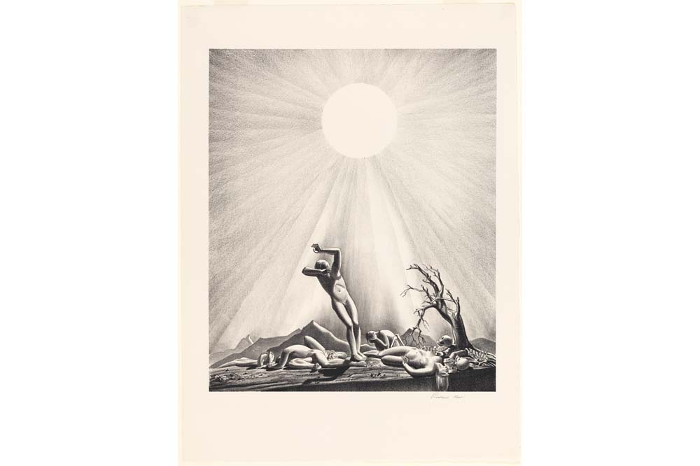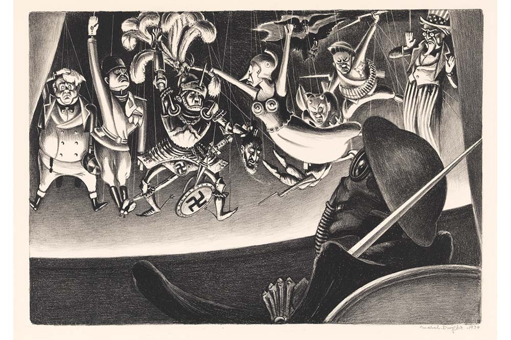Despite the movement’s self-portrayal as a literal avant-garde against – among other things – painting that “loses itself in abstractions or trivialities,” its nine-hundred artists embodied a multitude of visions as to how the new-world order might come about. For instance, Mabel Dwight’s Danse Macabre (1934) is a realistic satire – a sort of lithographic political cartoon in which marionettes of Uncle Sam and John Bull hang, worrying, to the sides of a samurai armor-clad Hitler, his neo-Classical heroes and goons. Death in a gas mask is the only spectator of these political theatrics. Other artists revert to social mysticism, portraying a sort of mechanized apocalypse that might eventually allow for the world’s rebuilding. In Rockwell Kent’s Solar Fade-Out (1937), supposed remnants of a distant city stand in supplication, holding one other beneath a sun that’s revealed in its full glory just before or after a passing eclipse. Many members of the JRC and the subsequent American Artists’ Congress disagreed with what they felt to be an emphasis on negativity.