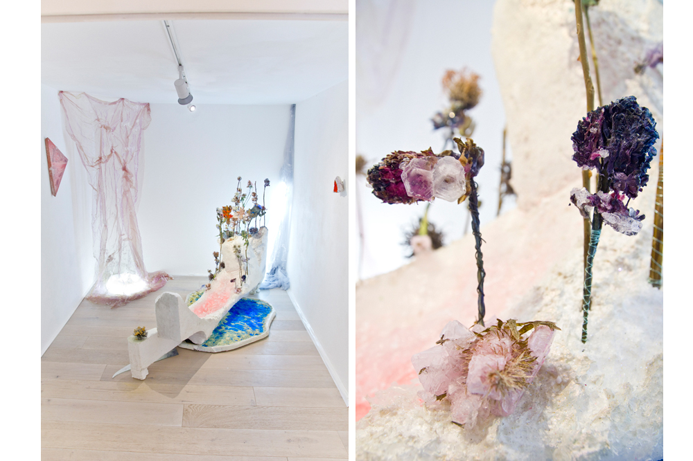 Her show-stopping recent installation at London’s Lacey Contemporary, a mutant forest constructed out of real flowers upon which Weis had patiently grown crystals (yes, grown, not applied), and her upcoming contribution to the CHEMCRAFT conference/exhibition (the work’s a secret, so you’ll have to wait), have increased her artworld profile (such an awful shorthand word for a life’s work), and landed her representation with Berlin’s sexy new The Ballery, a former pop-up gallery turned “legit.”