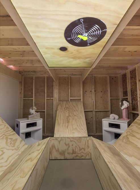 As for the “can” part of the question, the answer is “sort of.” A marked sort of. In taking over Mercer’s tall white box, VSVSVS opted to replicate their own ramshackle studios, which resemble a rabbit warren made of two-by-fours and plywood. This is a fantastic gesture – it not only gives the viewer something to do (one must climb stairs and ladders and slink down narrow corridors to find hidden rooms), it brilliantly recreates the confined, indeed constricted, reality of contemporary art making in Toronto, where every inch of too-precious space serves a function, perhaps insufficiently. The days of large, open industrial work spaces for artists are long gone, except for a lucky (i.e. wealthy) few. Visitors to VSVSVS mini theme park will be treated to rough benches made of freshly-sawed discount wood, unvarnished, tricky stairs leading to not-to-code elevated platforms, and a coffee station perched just under the ceiling, accessible only by a shaky ladder. This is life as an artist in Toronto. Every overpaid arts bureaucrat in this town, and they number in the hundreds, ought to be frog-marched to this show and forced to live in its cubbyholes for 24 hours. Splinters are complementary.