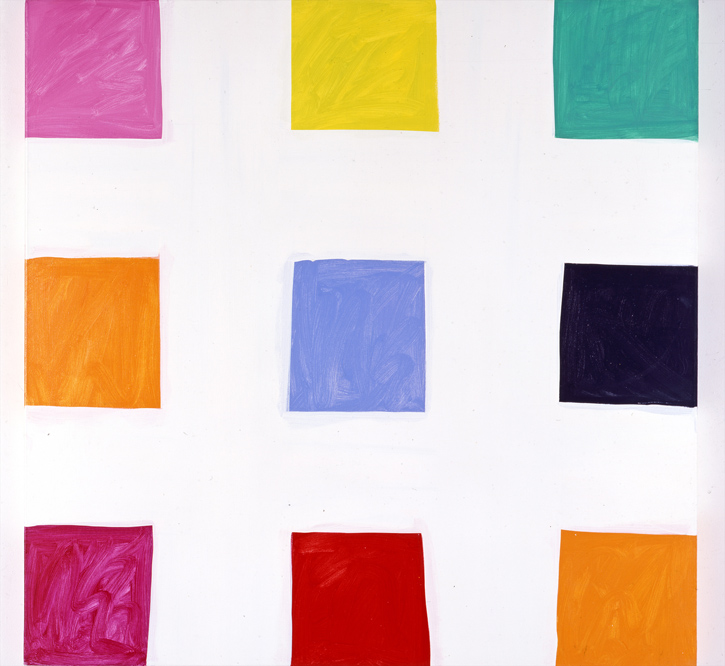 My flow through Two by Two wasn’t always unimpeded. After about fifteen minutes, a repetitive telephone ring emanating from the video loop in Scottie’s Bedroom began to feel like a drop of water on my forehead. In order to lose myself in the large hall wherein the paintings hang like so many duets, I have to move through a dark room populated by two videos. One was Heilmann’s slideshow, Her Life, 2006; the other Pamela and David Reed’s video In Our Solitude, 2014. Pamela and David are siblings, and the video is primarily a montage of images from their childhood home in California, built by their uncle John August Reed, an architect who, though never a household name, designed elegant houses in a Modernist, post-and-beam style. The siblings made the film as a pre-emptive mourning ritual, knowing, as Reed cryptically explains in his accompanying essay, that family and home would soon part ways. Ushering viewers between two slideshows into the main exhibition, the purpose of this room was to prime the show with a nostalgic – or at least recollective – undertone. But that priming was unnecessary, as the exhibition generally operates like a memory palace by other means; one built from abstraction, with associations following sensory rather than pictorial cues.