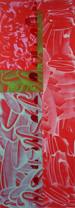 Reed and Heilmann are linked by their intense color, and their braiding of structure and fluidity. They diverge on the level of character. Heilmann’s opaque, wavy shapes are quietly and deliberately comedic. Reed’s folds and curls of paint are cool in their sexiness, like cigarette smoke. Over and again, within idiosyncratically long and narrow canvasses, Reed follows the brushstroke – about six inches across – into the fold, the arabesque, and then decorative blooms. Always, translucency discloses the illusion as illusion. In Heilmann’s paintings, a simple compositional structure – like a quadrant, say – often seems to have melted into three or four puddles of color. Rudimentary structures comprised of six or seven lines, meeting one another at angles, appear jotted in like a quickly-glimpsed spider web. In fact, this is the negative space produced by the efficient application of tape. Structure is intimated rather than rigorously built.
