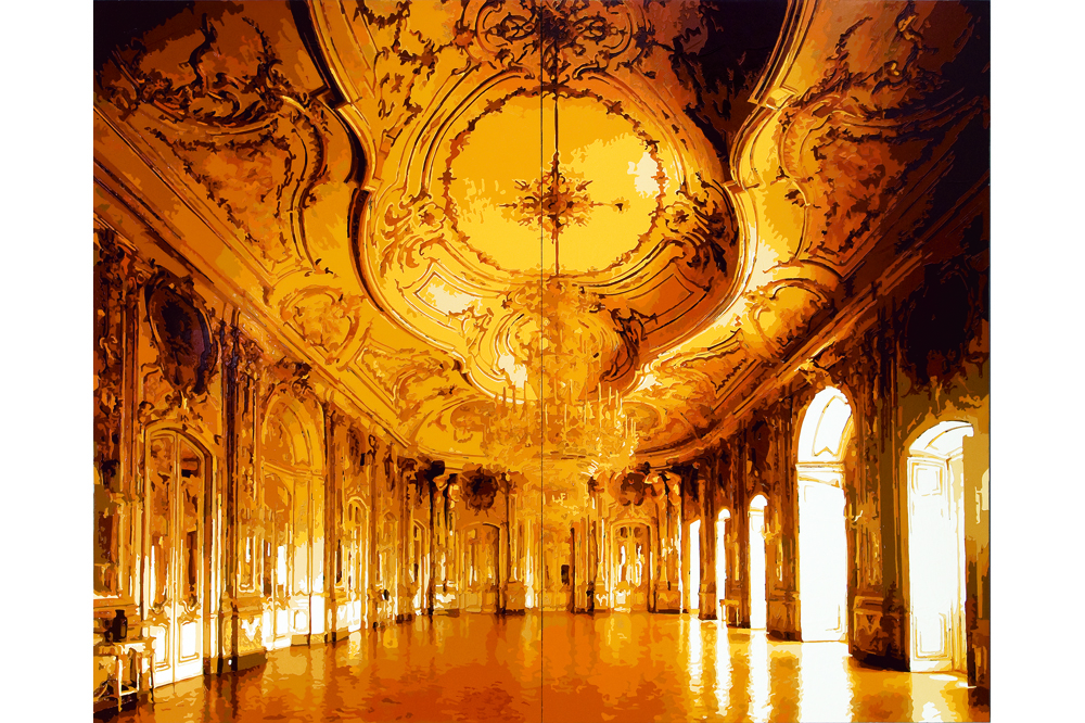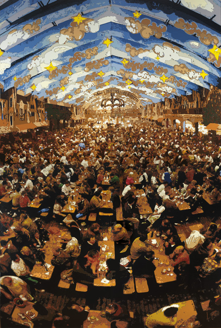 Dorian FitzGerald has produced the clear standout work, Hacker-Pschorr Beerhall (2005), a towering eighteen-foot, four-panel painting that, due to its size, has never been publicaly exhibited before. Because the ceiling of the gallery is too short to support its height, the painting has been installed at a forward-leaning angle. Hacker-Pschorr was created using a technique in which a scaled photographic image is transferred onto the surface of the canvas and subsequently outlined and filled-in with a thick application of caulk and acrylic paint. The paradox of FitzGerald’s work is that, from a distance, the image is characterized by a hyper-realistic, almost photographic precision – yet as we move closer it becomes increasingly formless. Through these material and spatial considerations, Hacker-Pschorr Beerhall interruptions the cool rationalism of the white cube and sharpens our attention to the fragility and ephemerality of visual recognition.