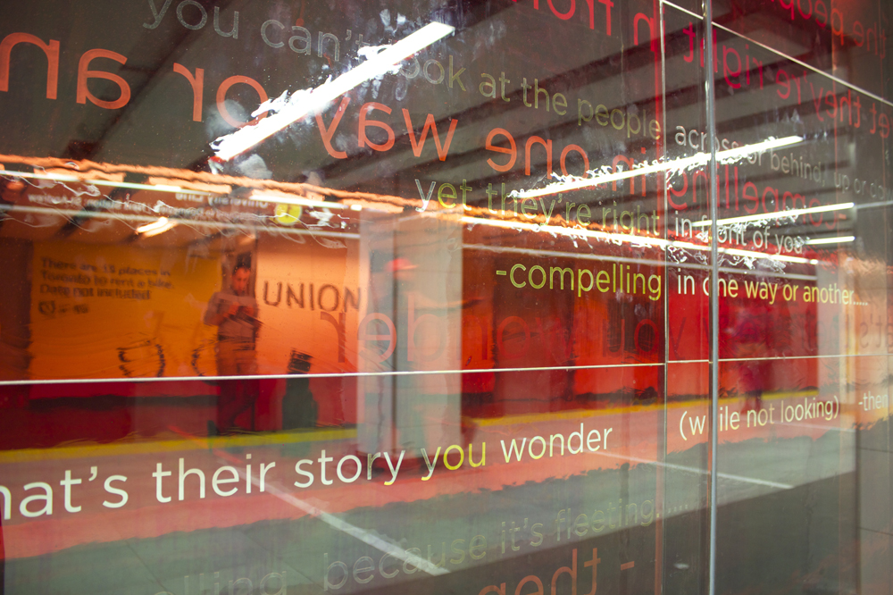 Toronto recently saw Union Station’s protracted and over-budget revitalization project achieve one of its first clear signs of completion, an expansive public art installation that runs the length of its subway platform and features a cinematic reel of stained-glass panels sketched with commuters and clips of poetic text. Produced by Toronto-based glass artist and architect Stuart Reid – who won the commission through an international competition and spent eight years on its realization, across Canada and Germany – the complex two-track glass partition required sophistication in its making and a certain legibility for its public. The result is a scroll of Reid’s sketched impressions from riding the subway cars, loose portraits of passerby as they move between metro stations and life obligations, pensive, distracted, anxious, tired, engaged. It’s public art in the tradition of real-time observational drawing, even as it maintains the bleeding palette, gestural line, and sweeping scale of Reid’s oeuvre (which includes the Salzburg Congress, Toronto’s St. James Church, and Living Art Centre, among others). But unlike Honoré Daumier, a mid-nineteenth-century caricaturist who reflected the French people back to themselves, achieving the role of acute social commentator; or, say, Michael Snow, whose mawkish Skydome sculptures convey a balloon-cheeked jeer, Reid has attempted something like realism with a shaky, handheld mirror. And as such, he’s produced a work of public art that’s dangerously sincere.