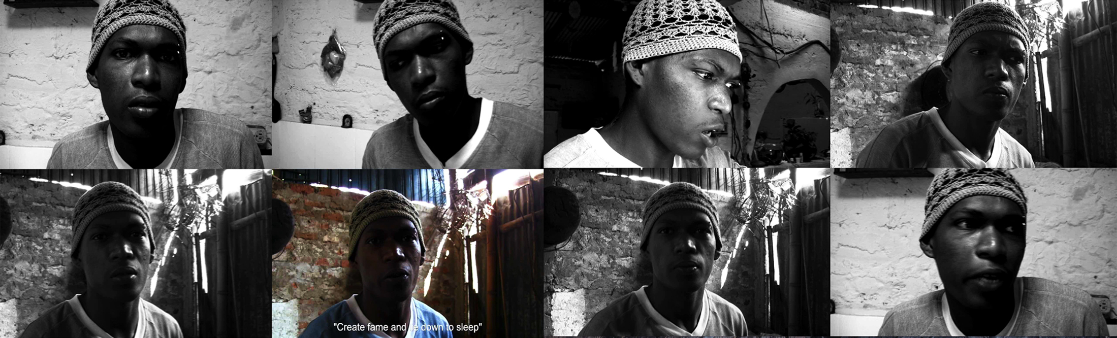 The reason that I included clips from the youths’ own works is because I realized that when they use fictionalized violence, they do it as a way of documenting their own lives. Fiction is a way for them to document their stories, resolve problems, and propose solutions. It is a way to redeem themselves; to position themselves within the violence while finding ways to survive it. It is a game where you don’t die, but if you do die, it is because you went the wrong way. And most of them have been living their lives “the wrong way,” and doing these works within the workshops helps them to better see themselves and move along creatively. I interviewed the youth, and they in turn interviewed others. The work became a mesh of their own views and mine. I would say that MOVING STILL_still life is the sum of fragmented individual experiences that create multiple narratives.