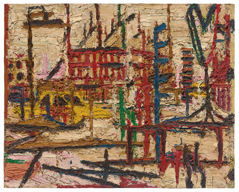 In his landscapes, Auerbach employs a phenomenological approach, integrating his varied experiences of a site into a single image. Spaces in his work are hardly spatial at all: they wed mutually exclusive perspectives, affording us access to a whole that we are precluded from witnessing in reality. From a jumble of paradoxical angles emerges a domain without discernible scale. Here, we escape the limitations of situated subjectivity to see a street or garden from many viewpoints at once.