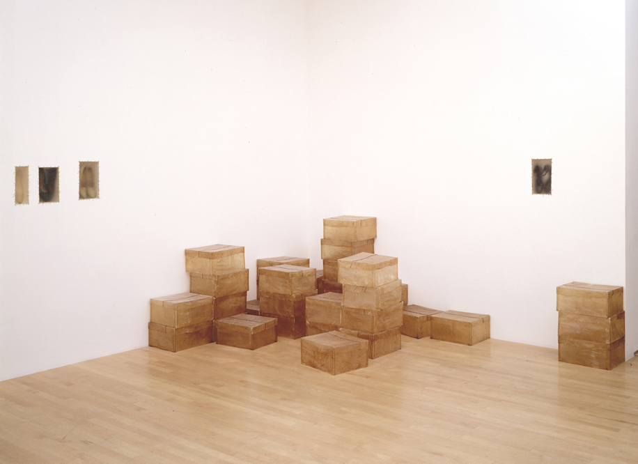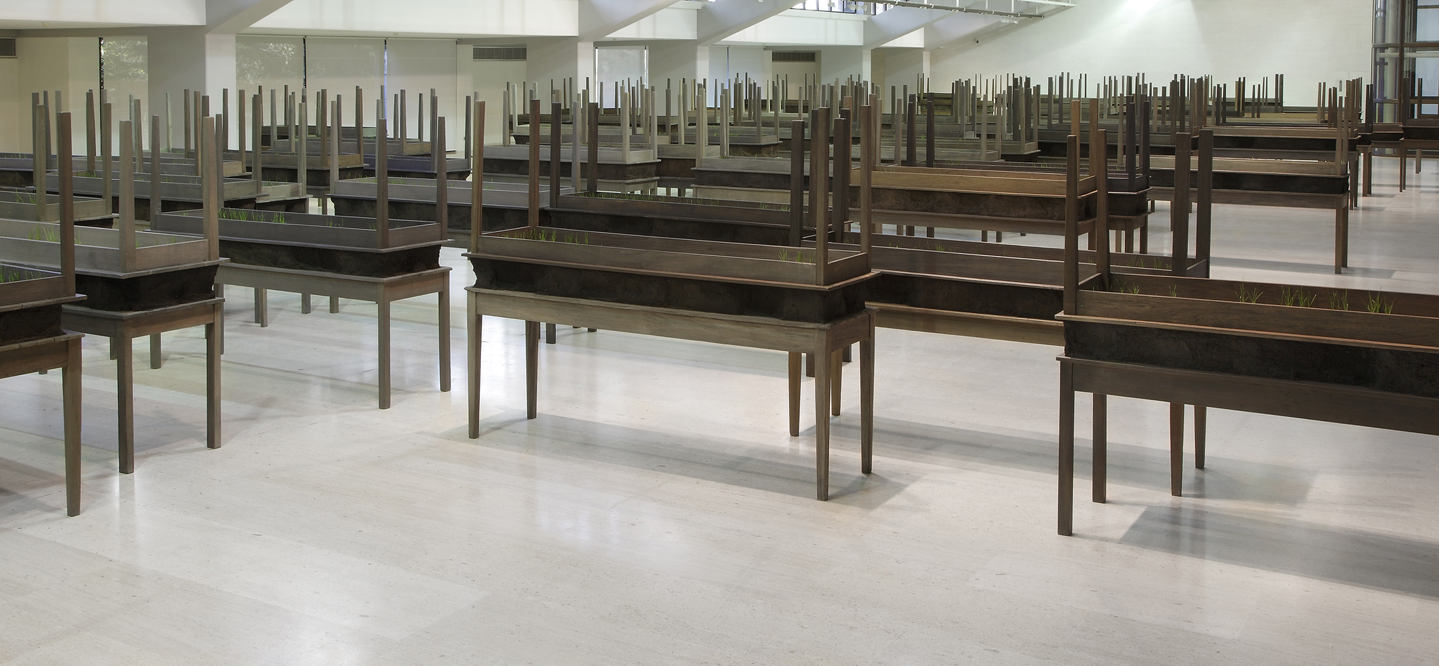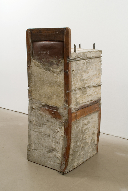 The exhibition, which groups Salcedo’s various bodies of works in clusters, charts the development of her material practice and demonstrates her penchant for reconstituting acts. An early sculptural series, Untitled (1989-2008), for instance, constitutes an army of armoires, dressers, and cabinets melded together and plugged with concrete. Bits of clothing peek out from the cold, grey surface. Atrabiliarios (1992-2004) encases shoes in rectangular niches cut neatly into drywall. A piece of animal hide is stretched over the opening and the edges are sewn shut with crude surgical stitches. Dotting an otherwise vacant white wall, the individual pieces within this series collectively appear like solemn cremation plots where footwear takes the place of urns. A more recent body of work, Plegaria Muda (2008-2010), presents a labyrinth of tables topped by a layer of soil, and an upturned table. Sprigs of grass poke through minuscule holes that punctuate the furniture. Collectively, these works perform a burial for an absent body.