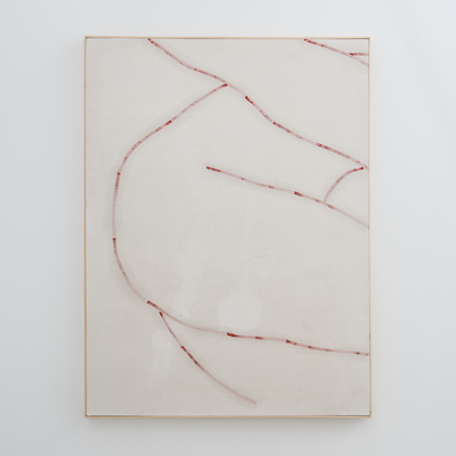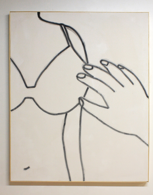 Just as she sustains a certain level of chance in her material processes, Ross sources the subjects of her work largely through impulse, she tells me. She does not consciously curate what she paints. Instead, she picks whatever she’s drawn to in the moment, either from her personal image base or online. Sometimes the selection is based on mood or memory; sometimes it’s simply the result of an attraction to form or composition. Once chosen, each image is carefully framed and fragmented so as to remove all evidence of its origins and context. The resulting works feature any number of subjects, from the safety strap used in teaching children how to ride horses, to a piece of folded modeling clay, to an abstracted human form. In each case, the subjects are separated from their surroundings, presented in a state of contextual isolation. By removing all detail and almost all evidence of their individuality, a literal and metaphorical flattening occurs. All background and surface detail are made unavailable and character-defining features tend to be cut off by the parameters of the frame. The works rely on outline and the nature of their material composition to convey whatever remains of their essence. By presenting her final works this way, Ross refuses to recognize any hierarchy between forms of representation and between negative and positive space. In fact, her final images seem to float in space, but are also grounded in that space by way of framing – as though it were possible to steal screenshots directly from the physical world.