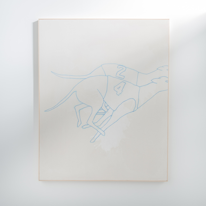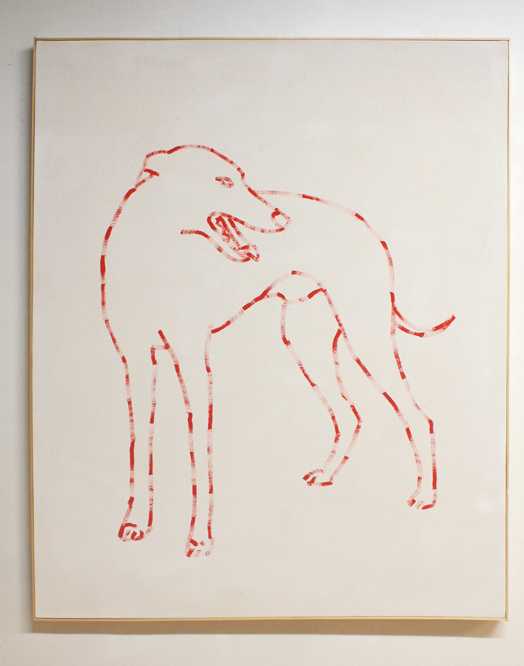 The exhibition text, written by Ross herself, positions the works in Most Dogs go to Heaven as “a collection of reassurances.” By allowing repurposed images to abandon their previous contexts, they become liberated to act in a new narrative based on free association. Ross begins her text by relating an anecdote that concerns a false but widely accepted report of the Pope’s position on allowing all dogs’ entrance into heaven. Although convincing as a stand-alone piece that echoes the overall mood of the exhibition – much like a word-based version of the visual works – the narrative focus of her text is narrowing, and its effort to impose structure where none is needed is overly directive. Instead, viewers would do well to allow the works to speak for themselves – as a collection of personally-selected archives of information that tell their story primarily through content and material. Applying a looser and more personal method of observing led me to discover the most successful connector between the paintings: the reoccurring imagery of the greyhound, the alternating fluidity and rhythm of the line, and the overall subtle variations in surface texture all point towards a decisive feeling of embodied motion.