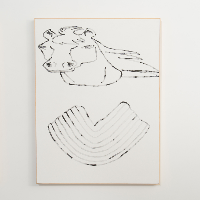 Beginning with the overworked marker scribbles that frame the dancing, negative-space portrait of Leaded, I noticed a gesture, ambulation, and dynamism distinct from Ross’s previous work. Hanging directly to the right of Leaded is MODEL 1, a piece that features the disembodied and digitally compressed head of a gif-style horse paired with a piece of folded modeling clay. Both the movement of the horse’s mane and the implied action of compressing and folding are distinctly energetic. My eye was led from the tips of the horse’s mane to the even distribution of dashes that form the graceful jaw line of a deer skeleton in Deseret 2. By deciding not to end, but instead extend, this line outwards beyond the frame, Ross was able to carry the piece directly into Go dogs go, an impressive marker and acrylic illustration of two racing greyhounds in mid-stride. Arguably the strongest piece in the show, Go dogs go is a singularly graceful portrait that typifies Ross’s remarkable commitment to her practice. Using the streamline quality of a rich turquoise marker and the selective elimination of the dog’s heads through framing, Ross endows this piece with a determined feeling of limitlessness. Only adding to the strength of it is an unusual use of gesso as more of a material rather than merely a grounding for pigment. Knowing full well how degrees of application affect the ease of pigment absorption, Ross has developed a technique of pouring gesso onto the canvas so that the surface depth and texture varies from deep white splash marks to a completely raw canvas. In Go dogs go, the gesso acts like an accent to the dog’s tremendous exertion, almost like sweat or excrement as it might accompany these creatures under such physical duress.