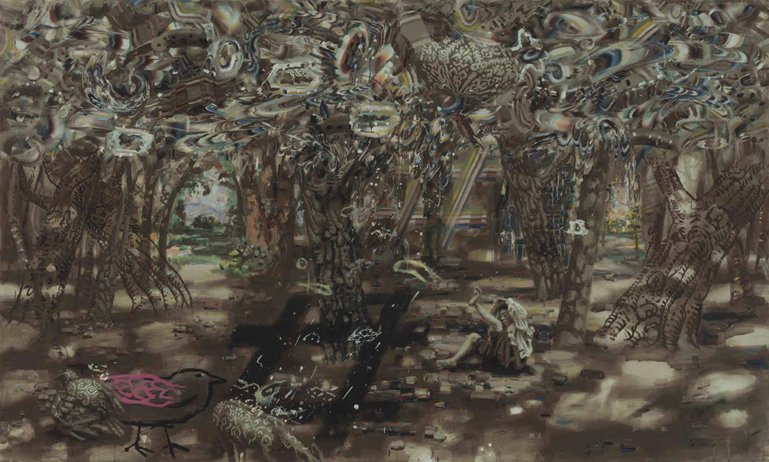 What is it that the paintings testify to? There is a storm brewing overhead, tossing around the marbled paper foliage of the trees. The looming crisis isn’t specified. Is this an ecological crisis? A break in our link to the natural world? Is it still possible to grasp some connection within this forest of images, or to find our way out of it? “The ‘state of emergency’ in which we live is not the exception but the rule,” wrote Benjamin. If we should attend to anything in this exhibition, let it be the “craft retelling” of this kind of anxious and prophetic insight, arresting the erosion of experience in writing it out by hand.
