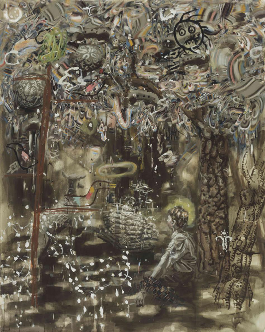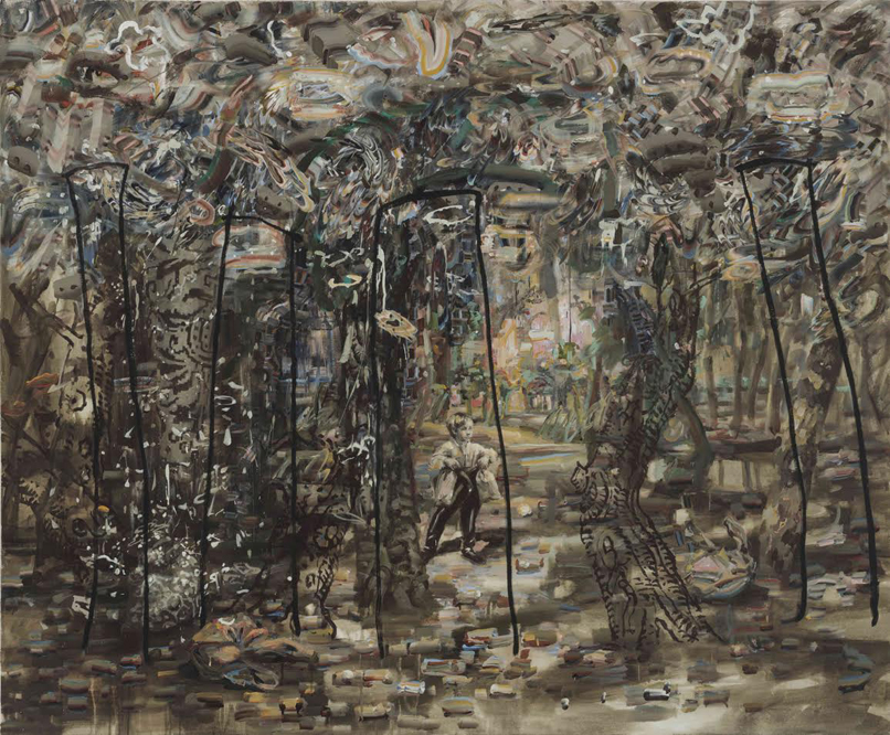 The children carry with them the presence of the past, a strange sense of being stale-dated. They could be lost in the forest, but that forest is a forest of symbols. “Trees” often appear as painted black outlines, reduced to the crudest of signs (though from one painting to the next these transmute into columns or perhaps the cylindrical cone of some tiny hurricane). Some, representations of representations, imitate ink drawings or etchings, while others look like illustrations painted “from life” after having escaped into the real world. The result is a dizzying array of different representational statuses.