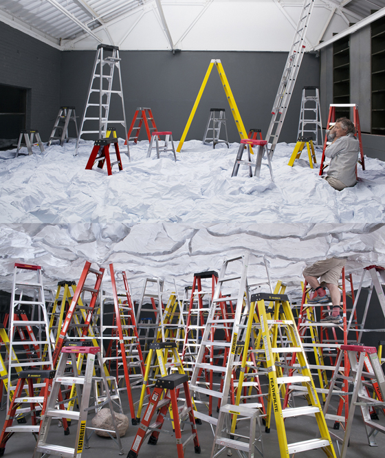 Dean adroitly characterizes each situation by his pose and expression. These are his fantasies, after all; he owns them. Given the effort and ingenuity that are required to recreate a long-held, pining wish, they are not to be wasted on inappropriate feeling. These images are the very vessels of exaltation, combining constituent ingredients of awareness, concentration, belief, and celebration. Only Perplexed slightly dispels the unlimited capacity of imagination. The picture fuses two shots. One was taken from the floor, below the cloud (crumpled paper in a loose wire net) into which we see only Dean’s legs as he climbs the steps of a ladder. In the second, shot from above, he has burst through the cloud into clear “sky,” only to see more of the same place, the familiar appurtenances of his studio, and a crowd of ladders, as if others have (or perhaps he has) been here before. Dean wryly punctures the attitude of the daydreamer.