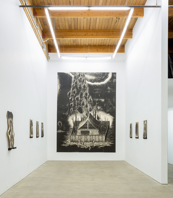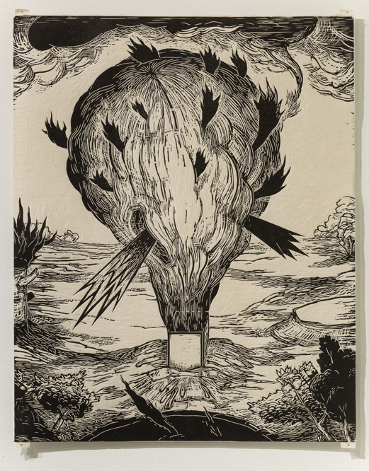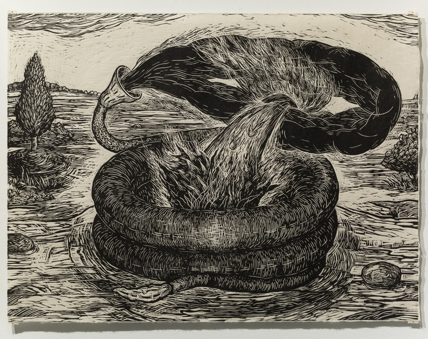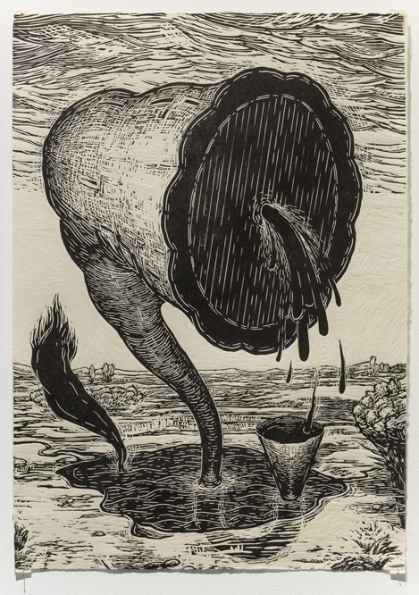 Echoing historic anxieties, Caulfield extends the tradition of European woodblock printmaking not just in medium but emotional tenor, too. Where Durer expressed apprehension over the Protestant Reformation through intricate scenes like The Four Horseman of the Apocalypse (circa 1497-98), the German Expressionists, in works such as Emile Nolde’s Prophet (1912), honed in on hopeful figures amid the turmoil of the exterminating onslaught. Caulfield zooms in even further by looking beyond the human subject in our age of oil, where it has become increasingly difficult to locate ourselves in the midst of global forces. Here, human presence is marked only by its traces: shelters, factories, and other man-made objects. Prints like Prairie Siren (2015) depict grotesque organic forms and architectural structures spewing oil-like substances and flames that tear up natural landscapes. Caulfield’s woodblocks, however, force this human presence into the wood itself. They lay bare the labor behind each work – every violence, every hand-carved line working against the wood grain – reasserting the hand of the artist, the damage, the build.