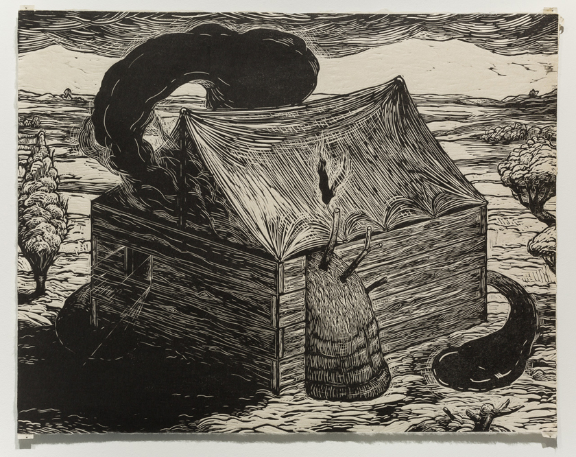 Reinforcing the elision of the human subject in his prints, Caulfield invites us to take our place in his titular installation, FireDamp. Made up of several prints and woodcuts, the piece explodes printed scenes into their constituent parts. A multi-layered smokestack reigns over smaller, individual woodblocks and prints of licking flames and floating spore-like forms. This is a world of disconnection where the industrial, though central, lacks the gravitational clout to keep the natural elements in order. Chaos is the guiding principle as Caulfield exaggerates the sculptural quality of his hand-carved woodblocks by printing directly on the gallery wall and haphazardly leaning woodblocks and printed Plexiglas against it. Navigating this expanded print, we become ensnared in the fraught prairie landscape of Caulfield’s childhood, trying to make sense of the looming structures scattered across the expanse.
