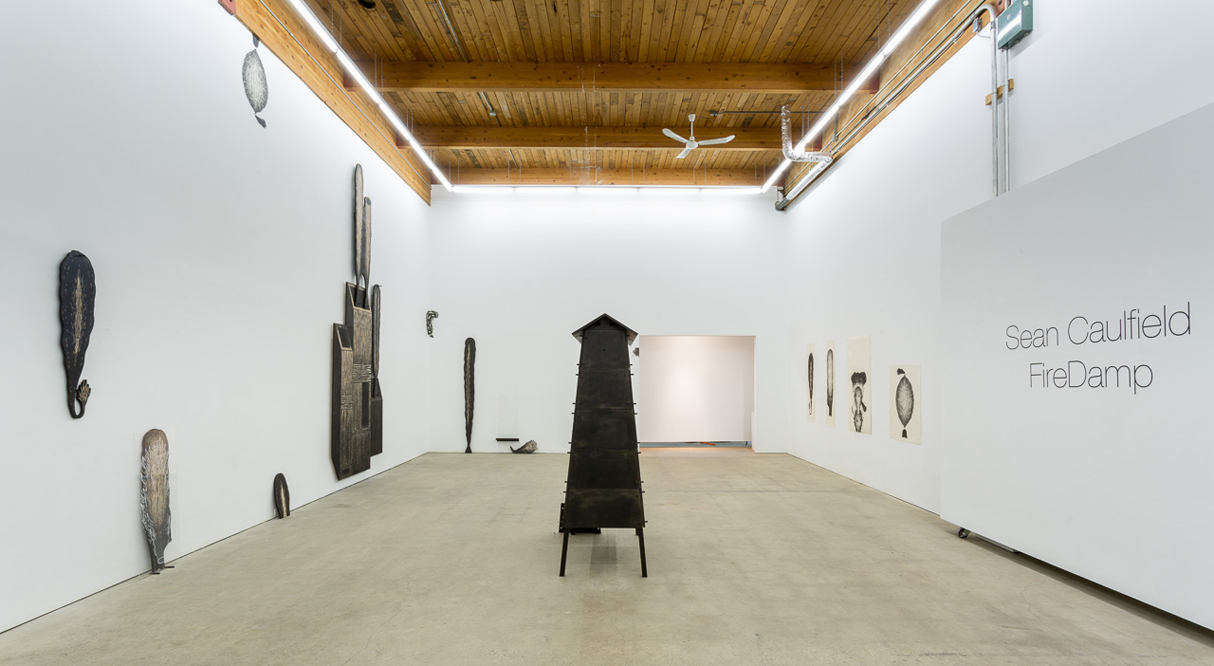 Caulfield’s Spring exhibition at Edmonton’s dc3 Art Projects, however, disturbs our anachronistic understanding of what constitutes as “natural,” offering a timely rumination, a happenstance of subject. In FireDamp – a mining term that describes the potential for destruction when environmental processes meet industrial ones – Caulfield’s meticulously crafted black prints and woodblocks depict uncanny ecosystems on the verge of collapse, leaking strange fluids, burning darkly.