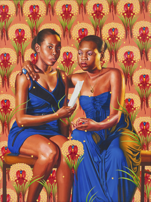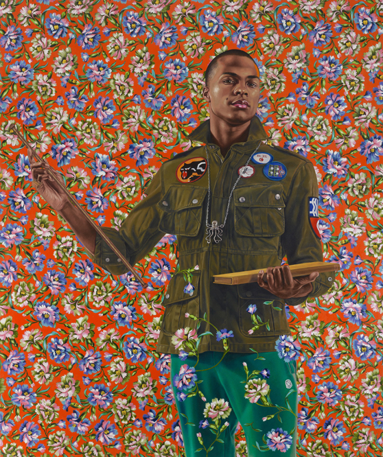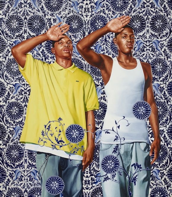 Truly, it’s difficult to fully commit to the idea that Wiley’s grand historical paintings are indeed corrective in themselves. The intricate backgrounds offset the subjects to flatly echo grandeur, power, wealth – but the disparity between the subjects and their staged settings prevents our ability to suspend disbelief. As Chloe Wyma notes, the source paintings into which Wiley inserts his urban subjects are too far in the past to convincingly comment on the subjectivity of black males in contemporary America – and even less so of those in the various nations that inspired The World Stage. His subjects are simply figures ensconced in fictive spaces that are republics unto themselves, stripped of context and history, distanced from the viewer in their frames. This is Wiley’s ultimate shortcoming: by leaning on the trappings of historical portraiture and contemporary pastiche, he traps his subjects into a flattened visual shorthand for urbanism. Their subjectivities are defined by negation, to their opposition to the luxurious backgrounds and the historical context of their source paintings, stripping them of the very power and autonomy that he claims to imbue them with.