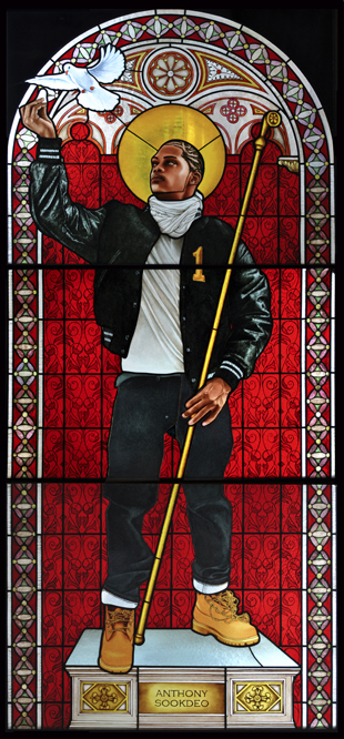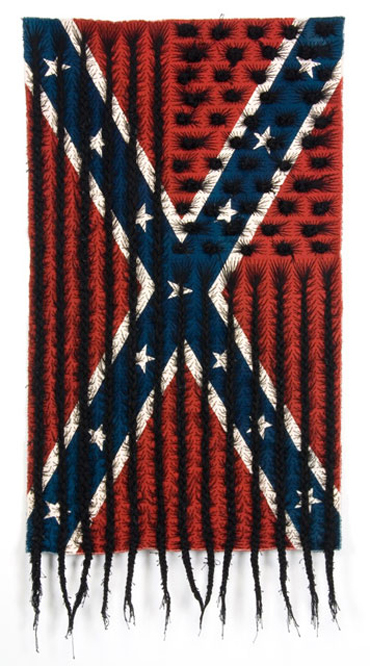 More difficult to draw from the museum’s collection is the connection to black representation in Virginia’s Confederate past – and perhaps, this is the point. The disconnect between the references to grand European portraiture and the more humble portraits of antebellum America sets in place a basis for contemplating the historical context of Richmond as it pertains to contemporary black art. Jefferson Gauntt’s portrait of Violet Anthony from 1832 is the most direct and relevant comparison. Violet, known colloquially as “Miss Turner’s old slave Violet,” was one of the last slaves in Philadelphia, a northern city in which slavery was legal until 1847. Identifiable as West Indian by her coral necklace, Anthony’s face is lined and wrinkled, her features and comportment given an attention to detail that is comparable to the sculptural quality of many of Wiley’s subjects. The museum’s contemporary collection, however, holds a more confrontational address to its provenance: Sonya Clark’s 2010 work Black Hair Flag weaves thread in the form of Bantu knots and cornrows through a Confederate flag, tying together the complex histories of a black subjectivity and a nation that would flatly deny its presence. Clark’s work, much like the work of her contemporaries Kara Walker and Sanford Biggers, engages the history of black subjects as the history of America, drawing upon the history of slavery to indicate that American nationhood itself is contingent upon the remembrance of black lives.