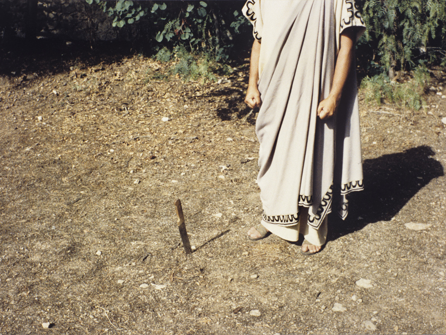 It’s fitting that the exhibition should meddle with Straub and Huillet’s easy inscription into history, given how their films loosen our purchase on time. In History Lessons (1972), a man in contemporary clothing interviews robed officials of Julius Caesar’s empire about law and commerce. The shots are deftly framed, and the saturated color elicits nostalgic winces. Only rudimentary cuts break the monotonous recitation, spoken in German (with English subtitles). But Abreu is kind to our distracted minds, offering a twenty-six minute excerpt of the film (actually a quality-control clip lent by MoMA to the Venice Biennale’s Italian pavilion, in 2015). Only one work, the brief Mallarmé adaptation Every Revolution is a Throw of the Dice (1977), is shown in its entirety. Through these disembodied bits, Straub and Huillet’s corpus hovers in the memories of its own distribution, degradation, and re-presentation.
