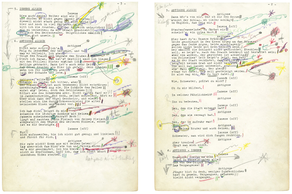 Fortunately, this ephemera is active, and testifies to the pleasure the pair took in text. This is literally the case vis-à-vis the annotated scripts. A similar material richness appears in the celluloid space of History Lessons: edges soften, and blemishes appear, as if seen through cataracts. The fetish value given to degradation, here, is in disagreement with the obsessive attention that Straub paid to the condition of the duo’s negatives, as documented in the Cahiers du Cinéma interviews. So the decision to show the film in this state suggests a murky compromise, and shifting ideals. Either way, the films now testify to the physicality of moving images, a condition today lost in the flow of digitized experience.