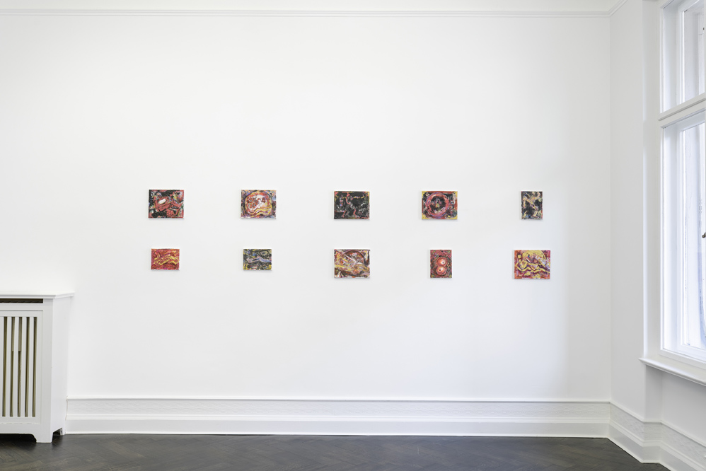 From across the room, the paintings in Zodiac Nudes, at Berlin’s Galerie Buchholz, approximate Renoir as imitated by Max Beckman, then exfoliated with an electric sander. Up close, garish fluorescence softly counterpoints wildflower color. In one room, there is a row of heart-shaped canvases. Some are slathered with cheap craft paint – pink, metallic, and tar-black – others are decorated with Cezannean apples. Daniel Buchholz himself picked the exact moment when I was gazing at these hearts to walk into the room and drop a gushing lullaby in my ear. “Only Jutta,” he crooned, “could manage this combination of Broodthaers, Freud, Balthus, and Bond” – all of whom appear in the show.
