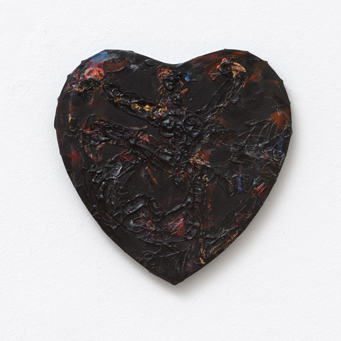 Thinking of Koether’s past, a photograph comes to mind, in which she sits with her cohorts Cosima von Bonin, Michaela Eichwald, Charlene von Heyl, and Graw. It’s called The Good the Bad and the Ugly, and was taken in 1991, by Hans-Jörg Mayer. Each woman has a machine gun. Most are dressed in black, and Koether is front and center, her hair double-plaited beneath a backwards hat and paisley bandana. In her essay, “Classics of Modernism: Jutta Koether’s Treatment of Canonic Painters,” Graw likens Koether’s swirling brushstrokes to van Gogh’s stars, which represented a “hope that life (on other planets) could also be different, less marked by contempt and humiliating experiences.” Applied to this show, the quotation intones Koether’s hearts with an almost idealistic, searching feeling (like that which might compel one to join a militant cult).