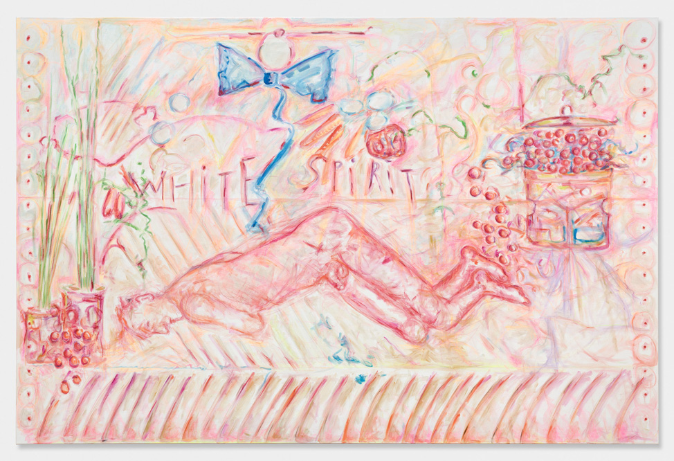 The subject of one large painting, Freud Broodthaers #2 (2016), is a man who floats upright in the painting’s center, with arms folded overhead. His eyes are closed – maybe because he fell asleep on Lucian Freud’s model stand, or maybe because he’s embarrassed about his vulnerable posture, like a business traveler in an airport x-ray scanner. Either way, he’s dropped his cane in the painting’s lower left corner. Fuschia dots trace the picture’s border, while a periwinkle bow, a large letter E, the word “AMUSER,” and a window frame float in a dream ether, made from brushstrokes in pink, peach, and blue.