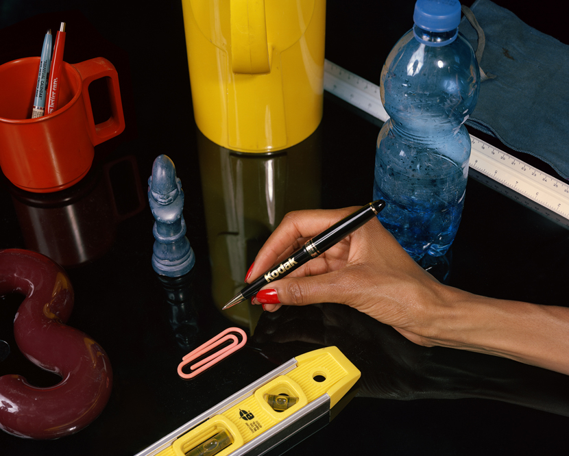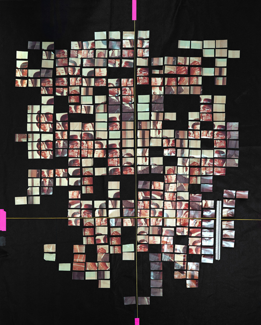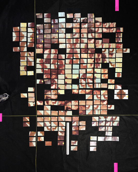 She departs from her signature still-lifes – and the photo-reflexivity they typically perform – to pursue a triptych of photo-collages that relays a single, formal exchange (a South-Korean business deal as pictured in found photographs dating from the 1970s) that’s essentialized through both truncation and repetition. In a series of cryptic, isolated gestures (hand shakes, turned necks, and glances), a deal goes down whose proportions are made both humane and suspicious. Disturbing the potential neutrality of these transactions, Cwynar emphasizes the interstitial or unnamable portions of her source material: for instance, the pink creases of shaking hands, or pointing fingers. From a distance, these appear like a voluble wash of rashing reds; up close, like abject servings. Importantly, the photo collage is positioned on a black floor, with yellow threads and pink stickers gridding the tableaux – and also picturing the wheel of her tripod – such that we’re reminded: this is the director’s cut (a favored authorial motif of the artist’s that risks over-use).