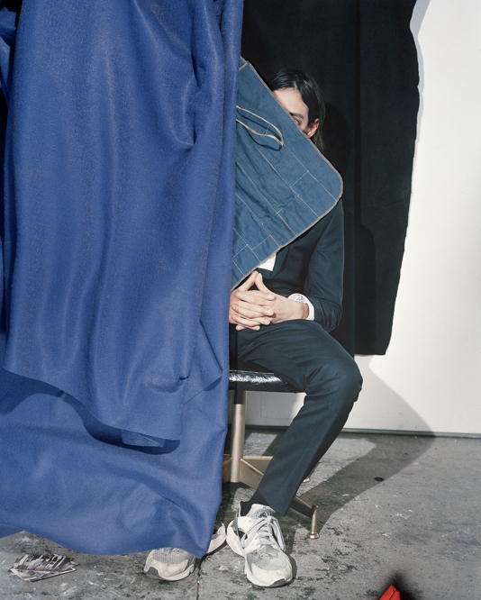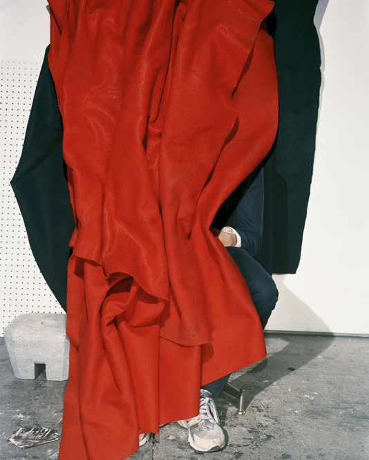 There are a few small portraits positioned throughout this limited body of work that serve an important function, and notably – also literally – foot the exhibition’s larger gestures. They feature Cwynar’s then-boyfriend shrouded by the felt used for green-screens, or to complement (or deflect) color in a photographer’s shoot. He’s tarped, or the lens is tented, so that you only see him in the margins of the frame, looking blank or maybe slightly assailed, and stringently lit. In one, he’s not only covered, but the print is whited out, and over top it reads “you never look at me from the place I see you.” A text is scribbled over this, too, reading: “enamored with your black-blue hair.”