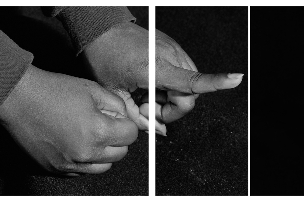 So while a pair of black hands gesticulates on a grand scale (one finger flicking out, a stardust of skin flakes falling away, while deceptively printed like a Vancouver-School triptych), we read it as a tonal inflection, rather than content – as anxiety-driving, or a formal invitation to alertness, like when someone says “look!” but you don’t know where to turn.