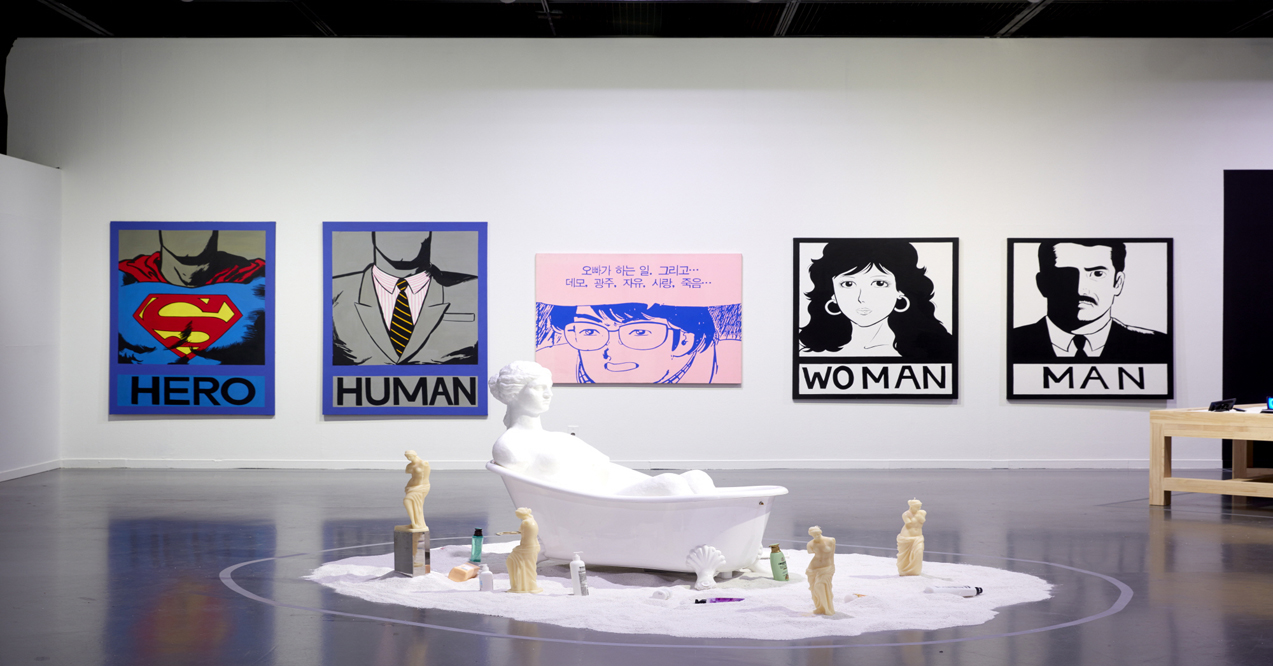 What we learn from this archival exhibition is that a unique libertarian underground language was developed in Korean art between 1987-1996, one that might be called “de-ideological,” with respect to recent historical precedents: the more conservative Modernism of the ‘70s and the populist (Minjoong) People’s Art of the ‘80s. The exhibition points to a society of “liberation and consumption,” developed in the 1990s, that has been deepening and strengthening ever since.