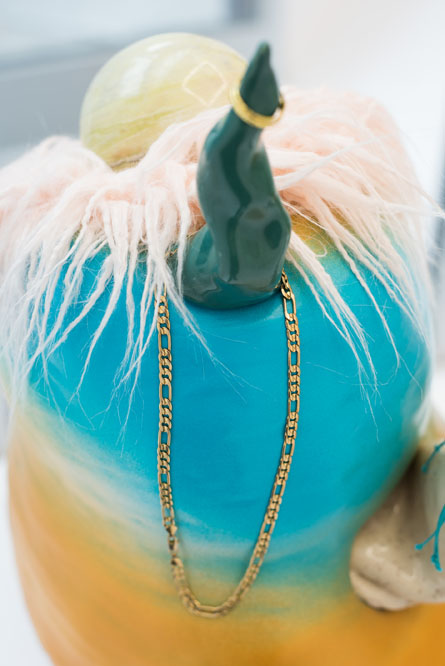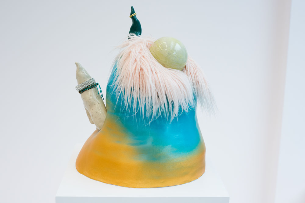 But the work is more than a body of degraded objects. For one thing, Kleiman ruthlessly points out how the backend machinery of desire works, especially in the dominant installation Mall Wall, which sprawls in all directions beyond its store window display, with particleboard flooring and half-built walls covered in artificial laminate. Mall Wall quite literally shows the back of its own machine, with visible clips holding in place curtains and the lights trained on the storefront. Inside the display case, tokens of wealth quickly reveal tangible cheapness: the crystal skull is artificial purple, the marble bust, an impossible bright blue. Many of the other works in the show operate on a smaller scale but employ the same visual rhetoric as Mall Wall, offering themselves up as both coveted objects and staging-sites for critique. Kleiman diffuses humor throughout this scene, as in If the Tooth Fits (2016), which proffers a giant sculpture of teeth sitting on a bar stool, seemingly ready to chomp into some instant gratification. The art itself is hungry for something to consume.