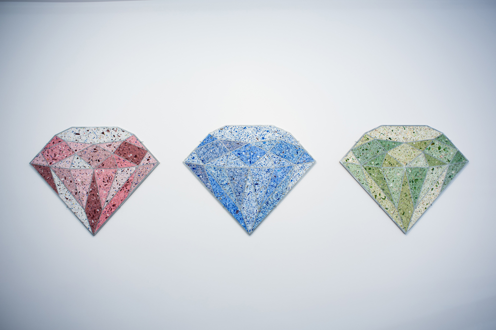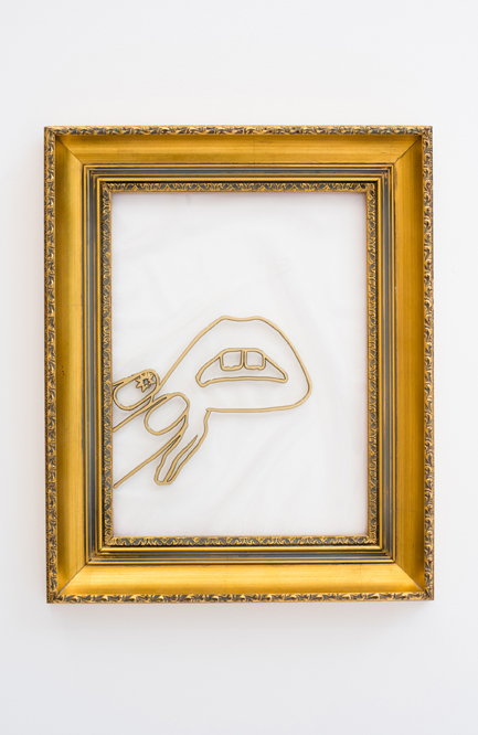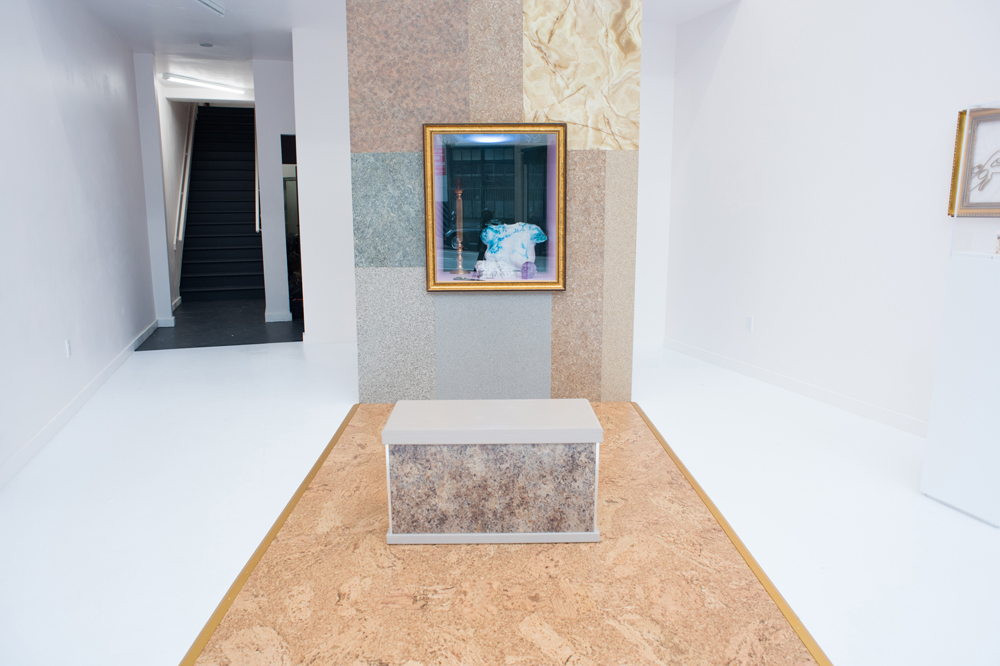 The visual language of the exhibition reads clean and fresh at first, its sculptures and installations packaged in the familiar Tumblr pink and gold accents of post-internet merchandise. Displayed in glass vitrines, elaborate gold frames, and – in one case – a replica of a department store window display (Mall Wall, 2016), Kleiman’s pieces lure with their bright colors and tasty suggestions of base desires: sculptures that look like dildos, wall pieces made of candy-like terrazzo flooring material, a crystal skull that, in recalling Hirst’s famous line regarding his diamond skull – that his medium is money itself – signifies simply price itself. Right away, the show colludes us with our own attractions to things. One wants not just to look at and touch Kleiman’s work, but to eat it, to screw it, to cash-in.