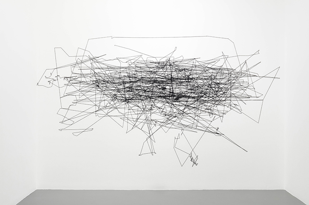 In preparation for his exhibition […] Prévieux organized a workshop with a group of students, staff, faculty, researchers, campus police, and employees of the administration at the University of Toronto Mississauga. Using an infrared camera, he recorded the movements of participants’ pupils while they were looking at his work in the Blackwood Gallery. Eye-tracking software was then used to produce diagrams that visualize the eye movements across the exhibition, with the final sketches reproduced in wool on the walls of the e|gallery.
