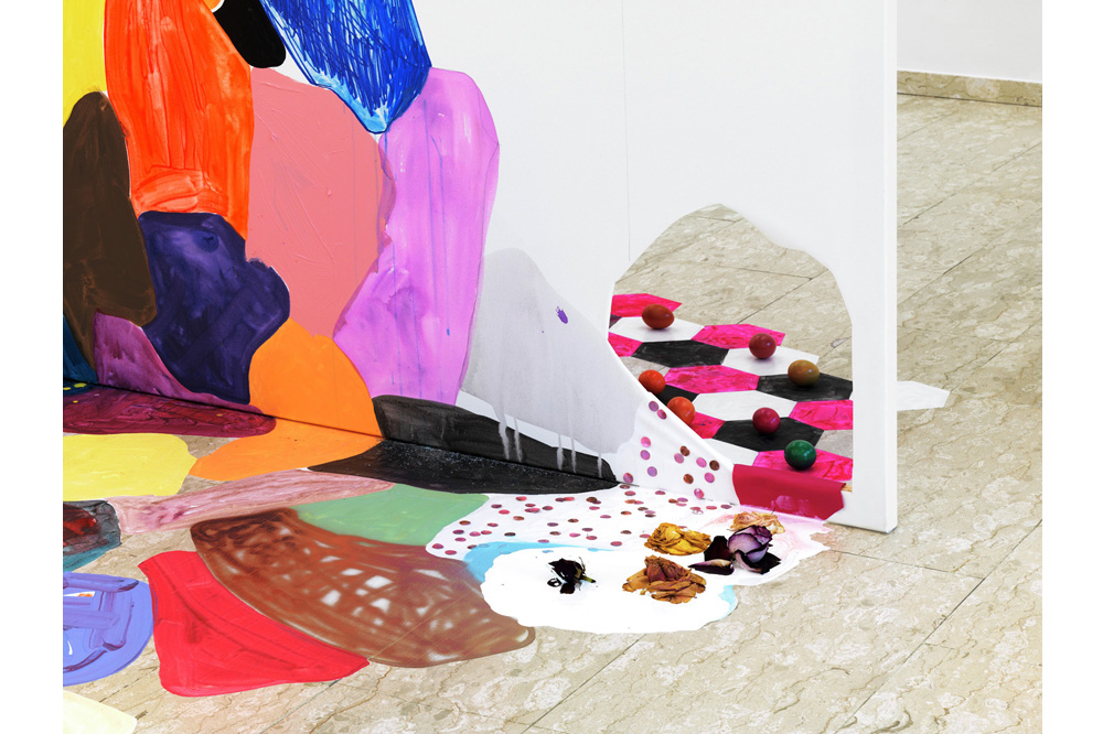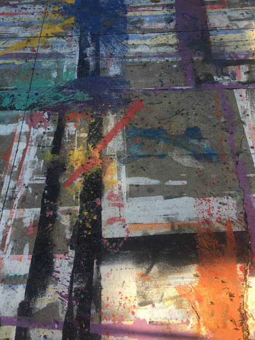 With scarred ears and bright eyes, a ragged pounce of cats haunt and scheme, dart and slink with battered elegance around the sacks of uprooted succulents and stacks of chopped cactuses awaiting wet soil on the paint splattered driveway. The concrete wears this drip and spray like a flamboyant party dress, a technicolor dreamcoat, holy robes for a thousand gods and none at all. This accidental mural looks as free and intentional as the painter who made it. Behind the glass garage door just beyond, Sarah Cain stalks a studio.