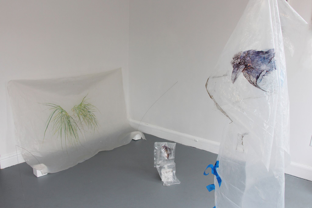 As with the plover, mistaken identity can change daily routine, and shape long-term policy. Escott shows herself complicit in the flawed, if earnest, logics underwriting these errors. In another piece, Domestic Interiors 3 x 5 (2017), she responds to studio visitors misnaming a local endangered butterfly Escott has been painting (the Xerxes Blue Butterfly), by acting as though these interlocutors are correct in their interpellation. In fact, she begins to grow the only plant, a type of lupine, that can serve as a habitat for the species that she wasn’t painting (the Mission Blue Butterfly). This lupine appears in the exhibition – also, of course, housed in plastic packaging. Slumped up against the wall in a comically long tube of soil with only a few leaves poking out of the top, the figure simultaneously evokes the inefficiencies of well-meaning conservation efforts; the ways that human tropes of ecology are limited by shallow, often mistaken perspectives; and how, seemingly, we must anthropomorphize nature in order to mobilize our care.