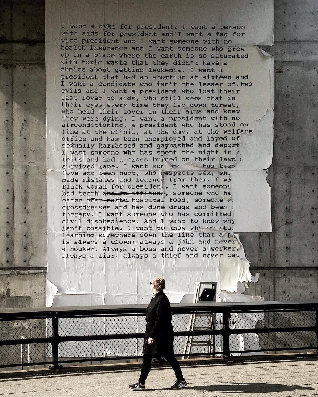 Snaking through New York’s burrows and bruised spirits, the city’s subway system presents a more convincing paean to togetherness than any artwork. While delivering people to work, the doctor, the library, and the courthouse, the subway joins people, albeit briefly. How significant, then, that Zoe Leonard‘s 1992 poem I Want a President was installed last winter as an enormous poster on Manhattan’s High Line – a former above-ground subway track now serving as a public greenway. A free-associated entreaty, Leonard’s poem pleads for a president who has suffered sickness, social stigma, and violence, and so many other torments. The implication is that such a leader might have the empathic and ethical ferocity necessary to fight for the marginalized. Leonard’s words rip open capitalist America’s barbaric obsession with profit at the expense of feeling.