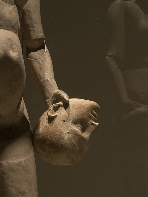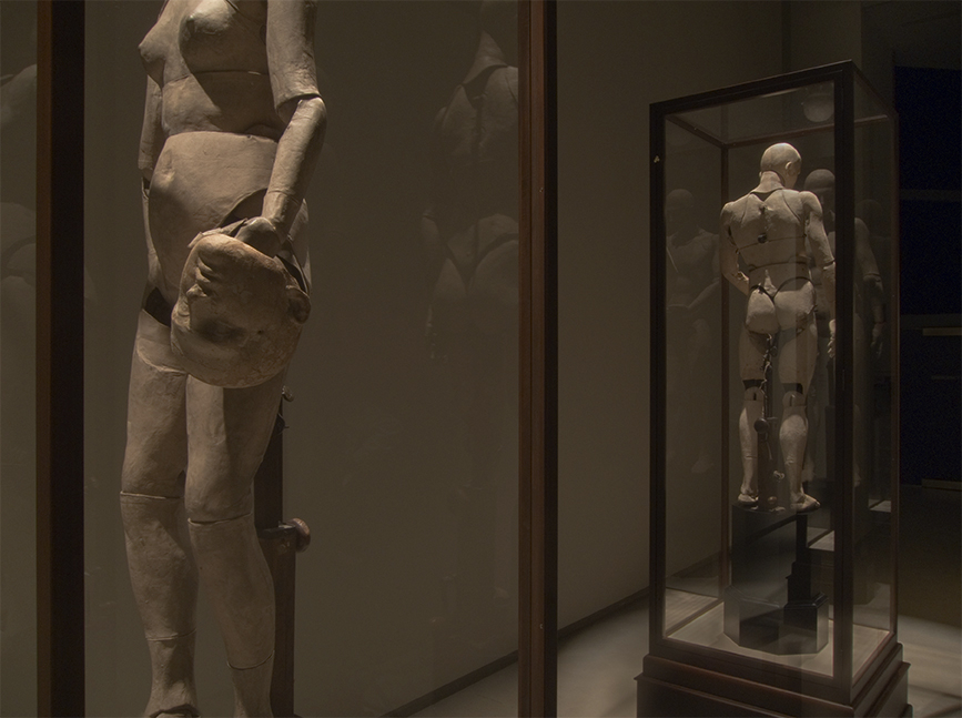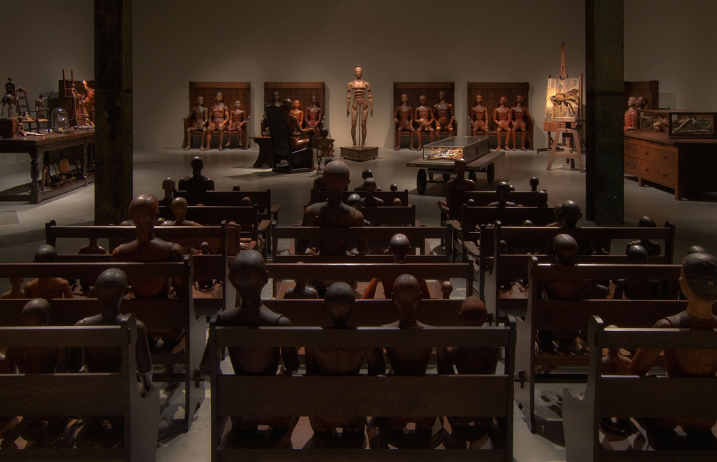 It’s hard to describe the installation’s uncanny effect of a hallowed space or to know where to begin its inventory. Let’s say that the display is not comprised of, but that it congregates 150 antique artist’s manikins of all scales, and stages them in a bizarre scenario. Why are they gathered here? What do they attend to, or witness – what testimony or trial? It’s open to interpretation. I know that Hendeles, in her concern for “the power dynamics of the group in relation to the individual,” sees the young girl sitting aside in her miniature armchair as a disempowered figure in contrast to the life-size man of power preaching from the front. But equally, I see the patient audience of this congregation in their church-like pews as waiting to awake from their wooden sleep, like Pinocchio or the Dutch Dolls, and rise from their societal exclusion to the acknowledgement of what we can read in those sincere placards of the American Civil Rights Movement: I am a Man. Can’t you see, though their facial and bodily delineations are Caucasian, that these are brown and black people: the color of the wood? What else are we to think when Hendeles’s scenario opens with the music of Debussy’s “Golliwogg’s Cakewalk,” proceeds to antique minstrel banjos, and continues with the illustrated children’s book that introduced the Golliwogg, companion to the wooden Dutch dolls who awake Christmas eve to their lively adventures? Artworks have the power to resonate in ways artists cannot control.