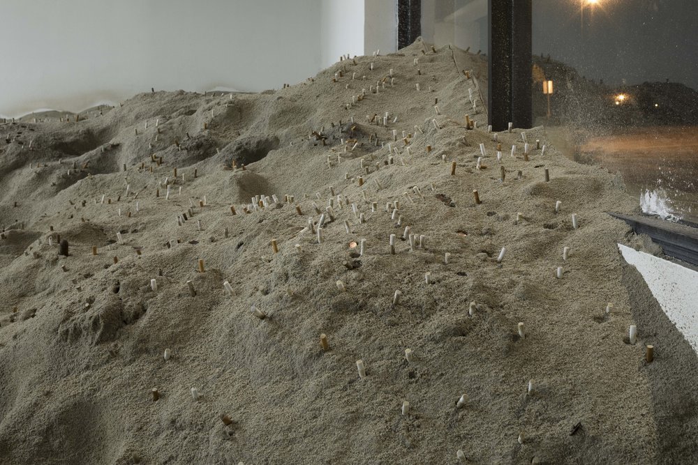 The unhappiest impression of Desert X 2017 is the image of an aestheticized and otherwise barely acknowledged desert as an analog for festival culture in an age of austerity and vulnerability. Of the missed opportunities, foremost is the precarity of the Coachella valley’s biome: the desert in-itself. The Colorado desert, which is massively irrigated in the Coachella Valley to support its golf courses, swimming pools, and agricultural production, is more vulnerable than ever. The only explicitly environmentalist work in Desert X 2017 was Gabriel Kuri’s Donation Box (2011), an installation full of sand and extinguished cigarette butts in an empty stripmall, into which visitors were invited to donate loose change: a vision of the desert as a sort of transfer station for detritus and value.