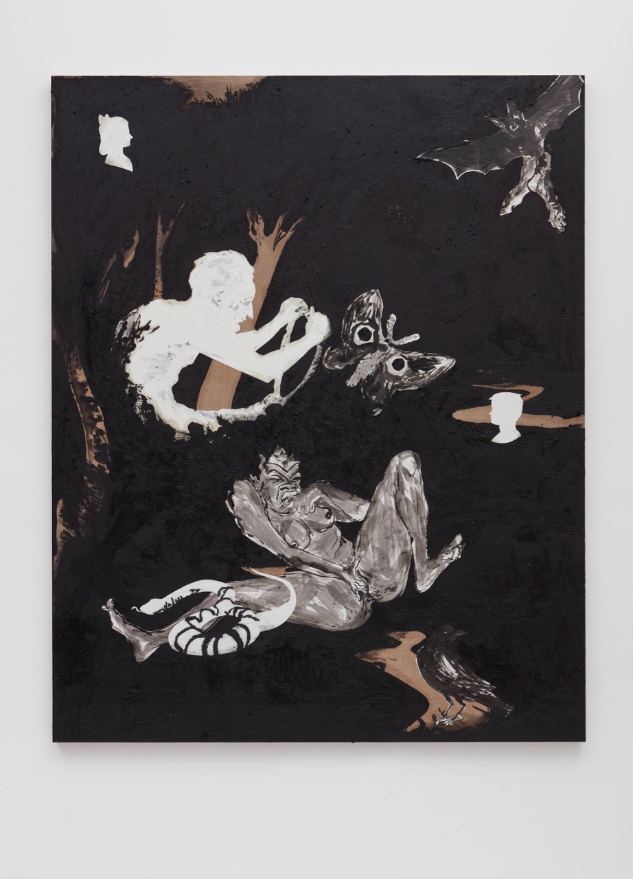 A pair of oval canvases attests to the voices ringing in Walker’s head as she made this work. In Storm Ryder (2017), the surface is violently blacked out save for the traces of the phrase “you must hate black people as much as you hate yourself.” Read from the position of a white (or non-black) viewer, the phrase is an explanation, if we’re willing to listen, of racism itself. But read from Walker’s position – that of a black artist who has long been criticized from within the black community for her insistence on recasting images of racism through the lens of black desire – it is a biting attack. In the companion piece, Dante (Free From the Burden of Gender or Race) (2017), Walker exploits the possibilities of her medium by rendering a female figure—another surrogate, it seems – in negative, the white paper standing for the skin of a nude body at risk of being enveloped by a murky black ground. Yet, despite this reversal, the figure remains (to borrow words from Walker’s artist statement) “a (proudly) raced and (urgently) gendered person,” for, as the title suggests, to be free from those “burdens” would be its own kind of hell. The pairing, it seems to me, encapsulates the weariness that comes from a career spent trying to hold the intimate and the spectacular in proximity, despite their propensity to reject each other – an impossible dream that she insists on, from press release to finished work.