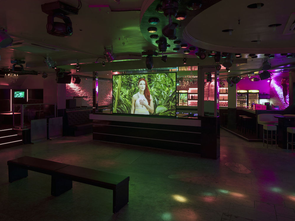 Elsewhere, De Burca and Wagner transformed a discotheque into a projector room, where their video Bye Bye Germany! A Life Melody (2017), played endlessly on loop. The piece is a parody of the German pop style schlager, a kind of kitsch music shaped by its supposedly reconciliatory, nationalism-infused singalongs. The artists employ local producers and singers to narrate a trivial love story, which is, ultimately, of secondary concern: the real subject here is the triumphal recreation of the schlager, the clear parody of a familiar, escapist way to exorcise ancient traumas in amnesiac times.